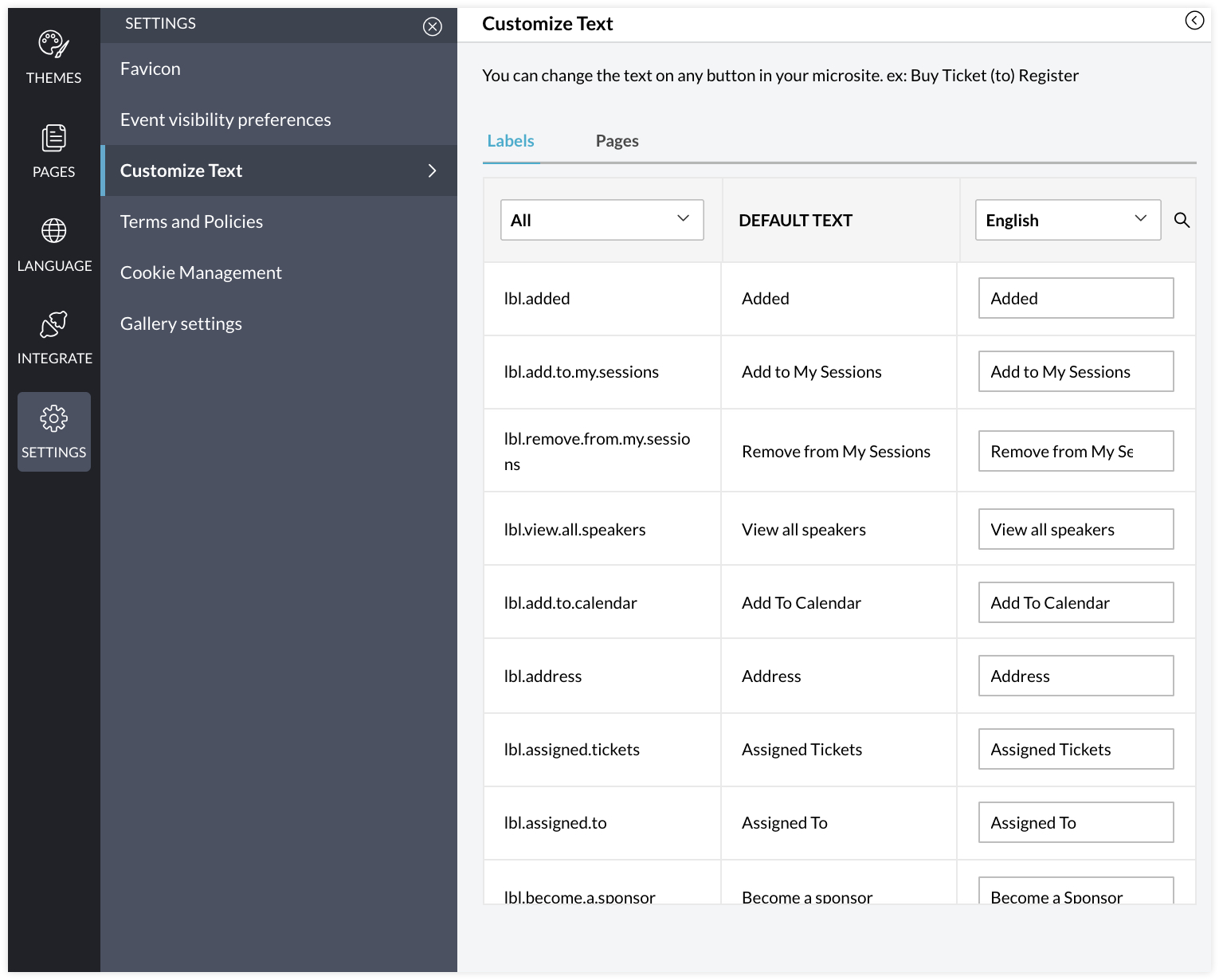 4. Labelsタブでは、イベントWebサイト内のすべてのUIラベルとメッセージが一覧表示されます。左側のドロップダウンメニューでテキストをフィルタリングし、ラベルまたはメッセージのみを表示できます。