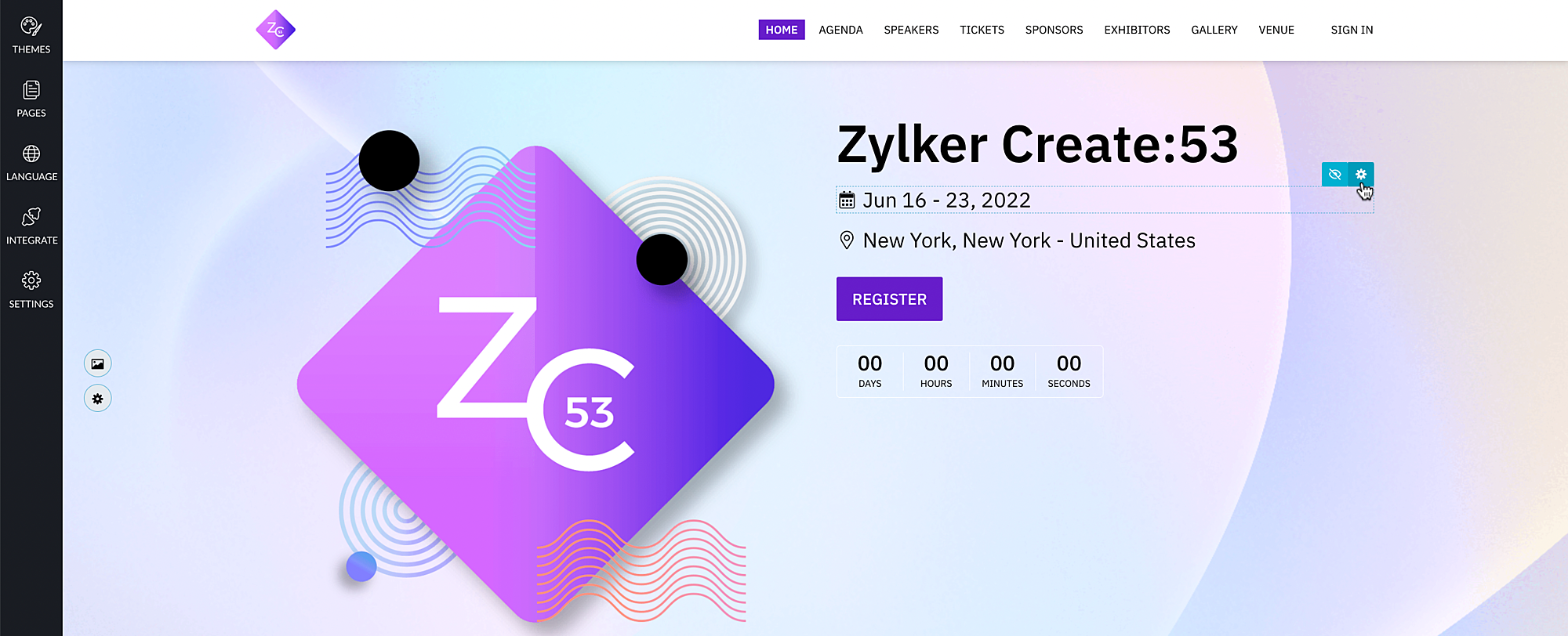 3. ヒーローセクションの日付、時間、および会場の要素の上にマウスを移動します。