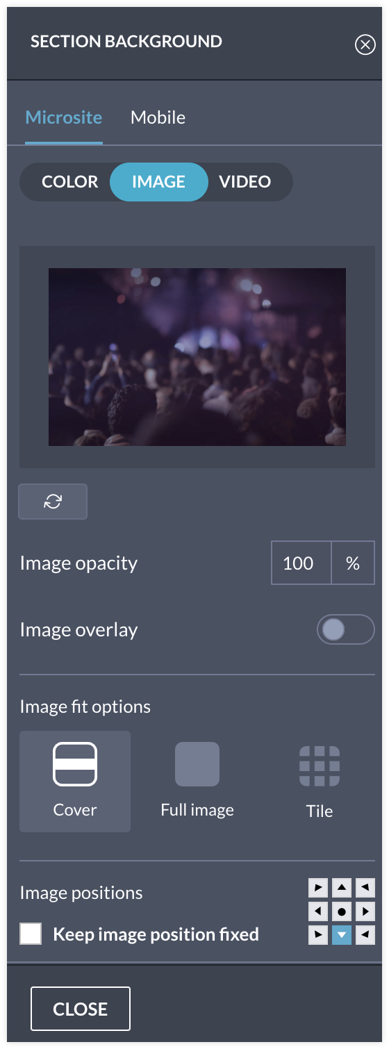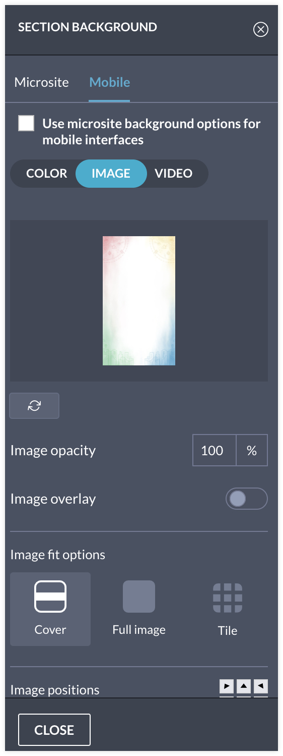 2. Backgroundオプションをクリックします。デフォルトでは、セクションの背景設定はウェブサイトと同じくモバイルインターフェイスにも適用されます。