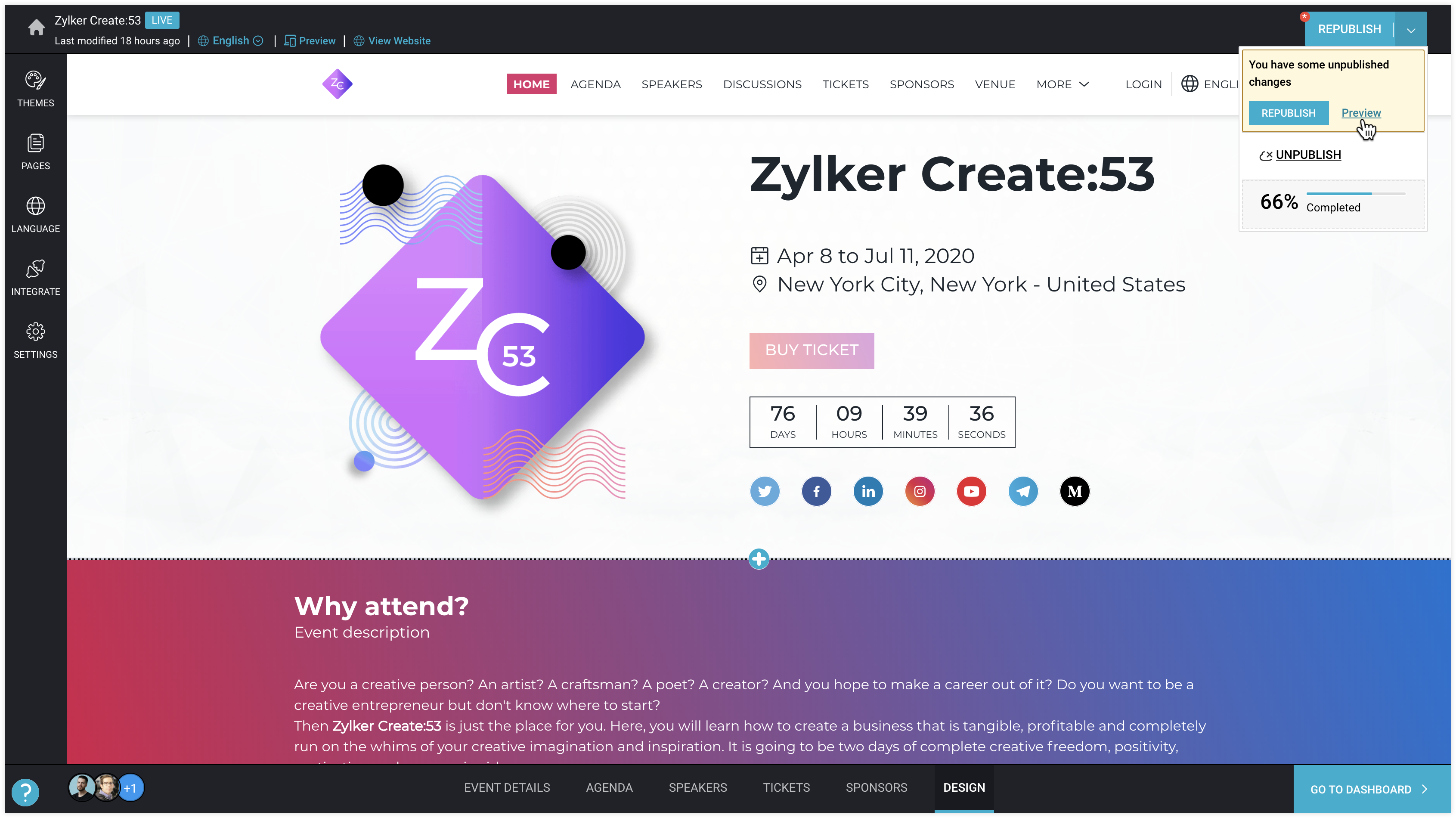 公開済みWebサイトの内容を変更したい場合があります。たとえば、TBAセッションの確定した日付を追加したり、新しいスピーカーを掲載したりする場合です。これらの変更を再公開して、有効なWebサイトを常に最新の状態に保ちましょう。
