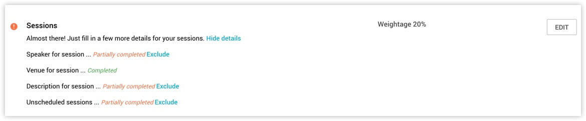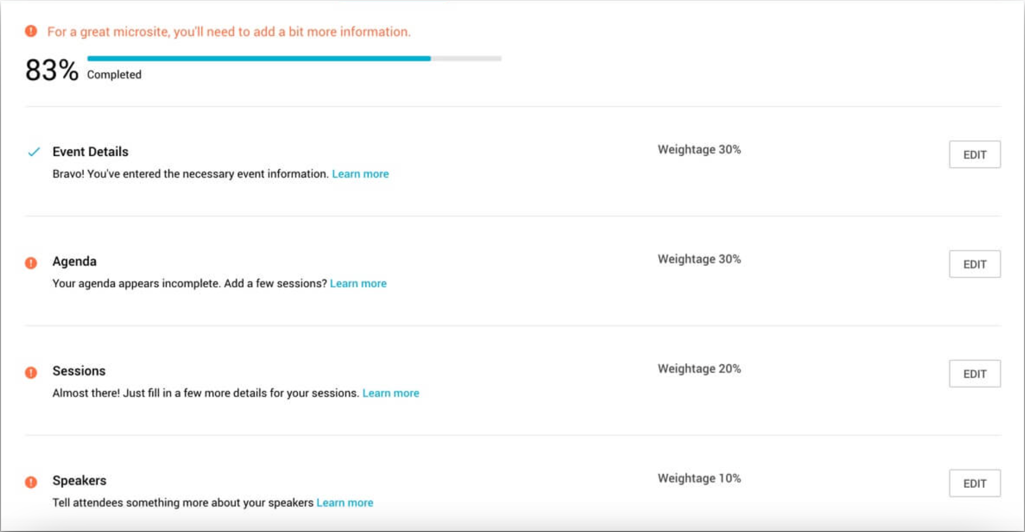 関連情報が不足している未完成のWebサイトは、参加者や見込みゲストにとって魅力がありません。改善できる箇所の概要を把握し、不足している詳細情報を入力しましょう。