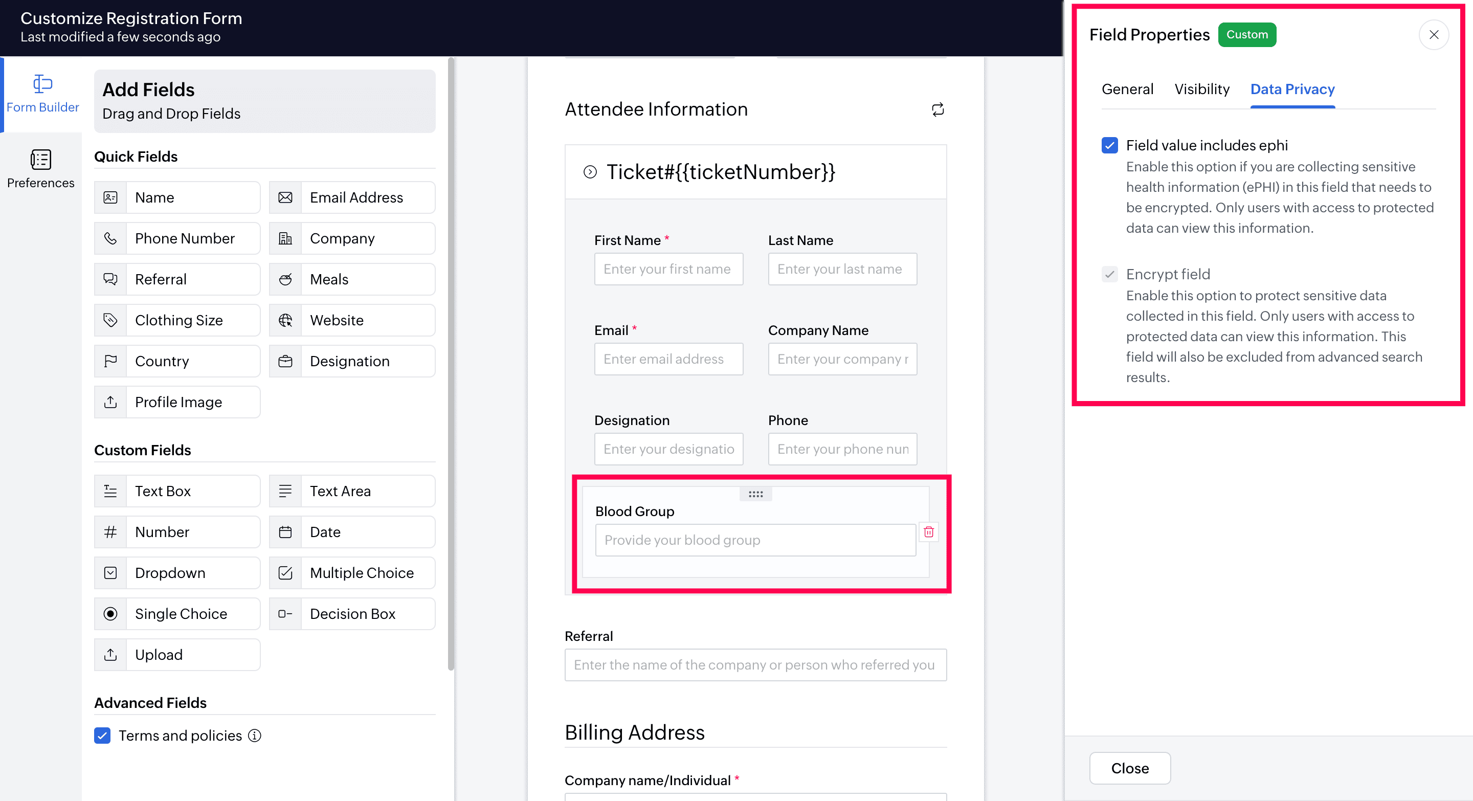 ウェブサイトのフォームを通じて提供される機密情報を、自動的な暗号化のためにePHIとマークした項目で保護します。保護された健康情報を含む項目の暗号化により、追加のセキュリティが提供され、機密データへの不正なアクセスが防止されます。
