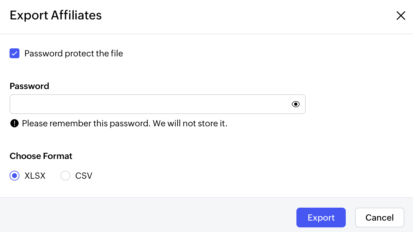 アフィリエイト一覧のオフラインコピーを作成できます。コピーをダウンロードする前に、ファイルを安全に保護するためパスワードの設定も可能です。
