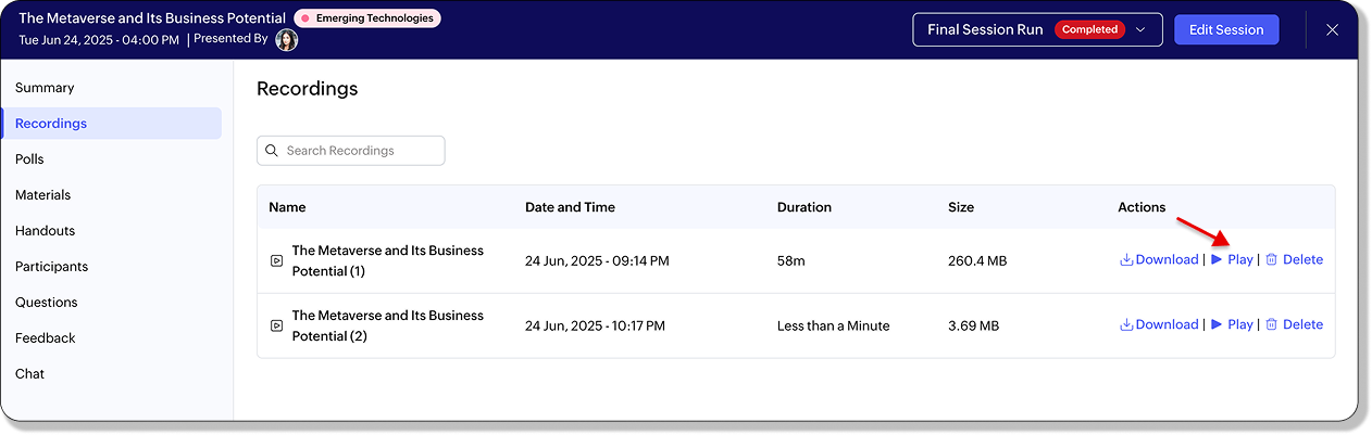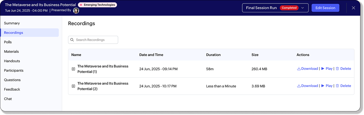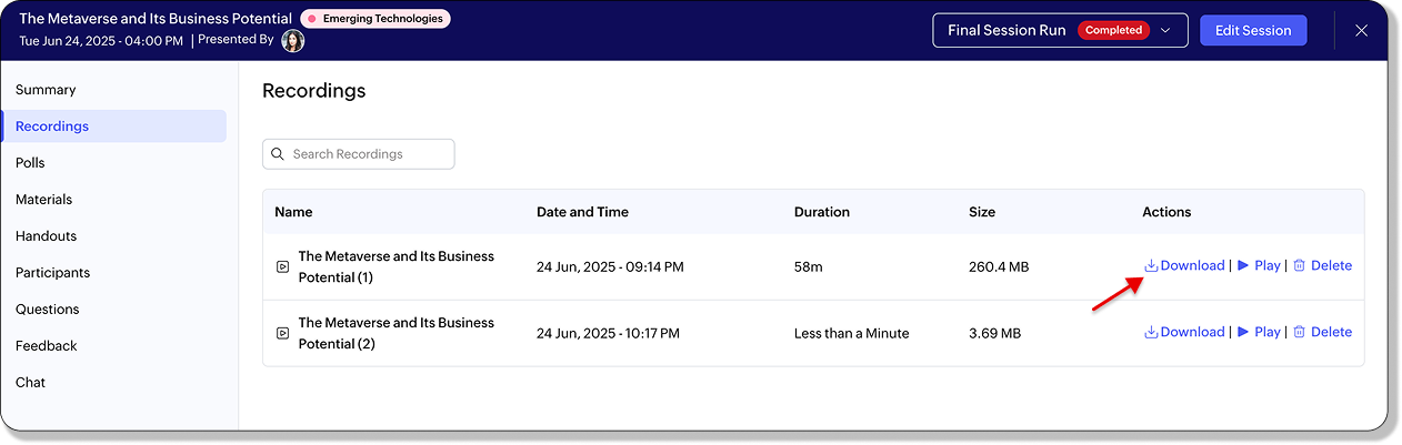 ここで、そのセッション中に作成されたすべての録画一覧を確認できます。