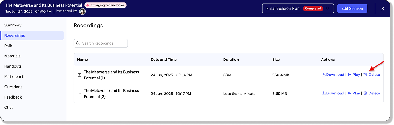 6. ダイアログで削除を確定すると、そのセッションから録音が完全に削除されます。