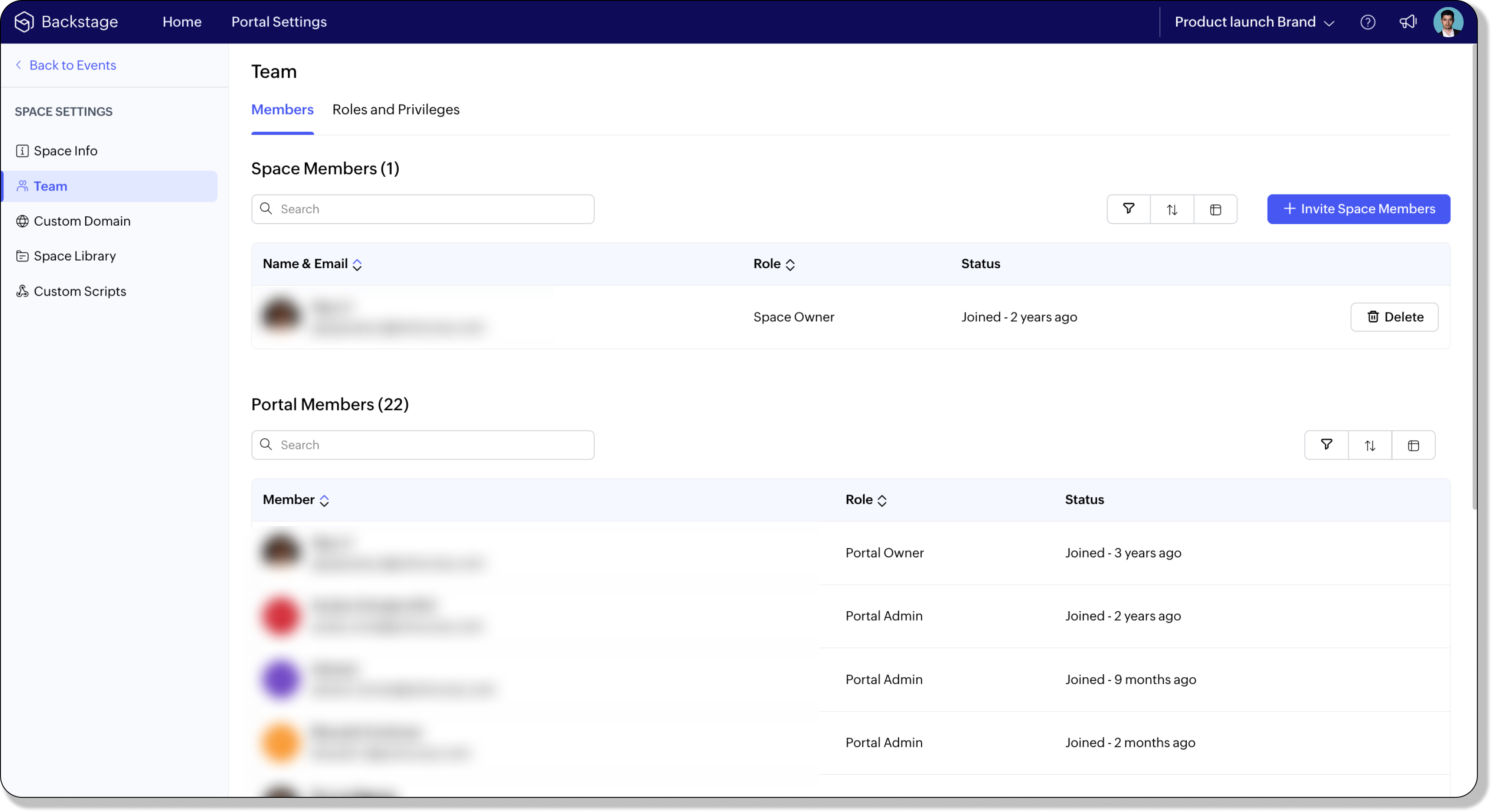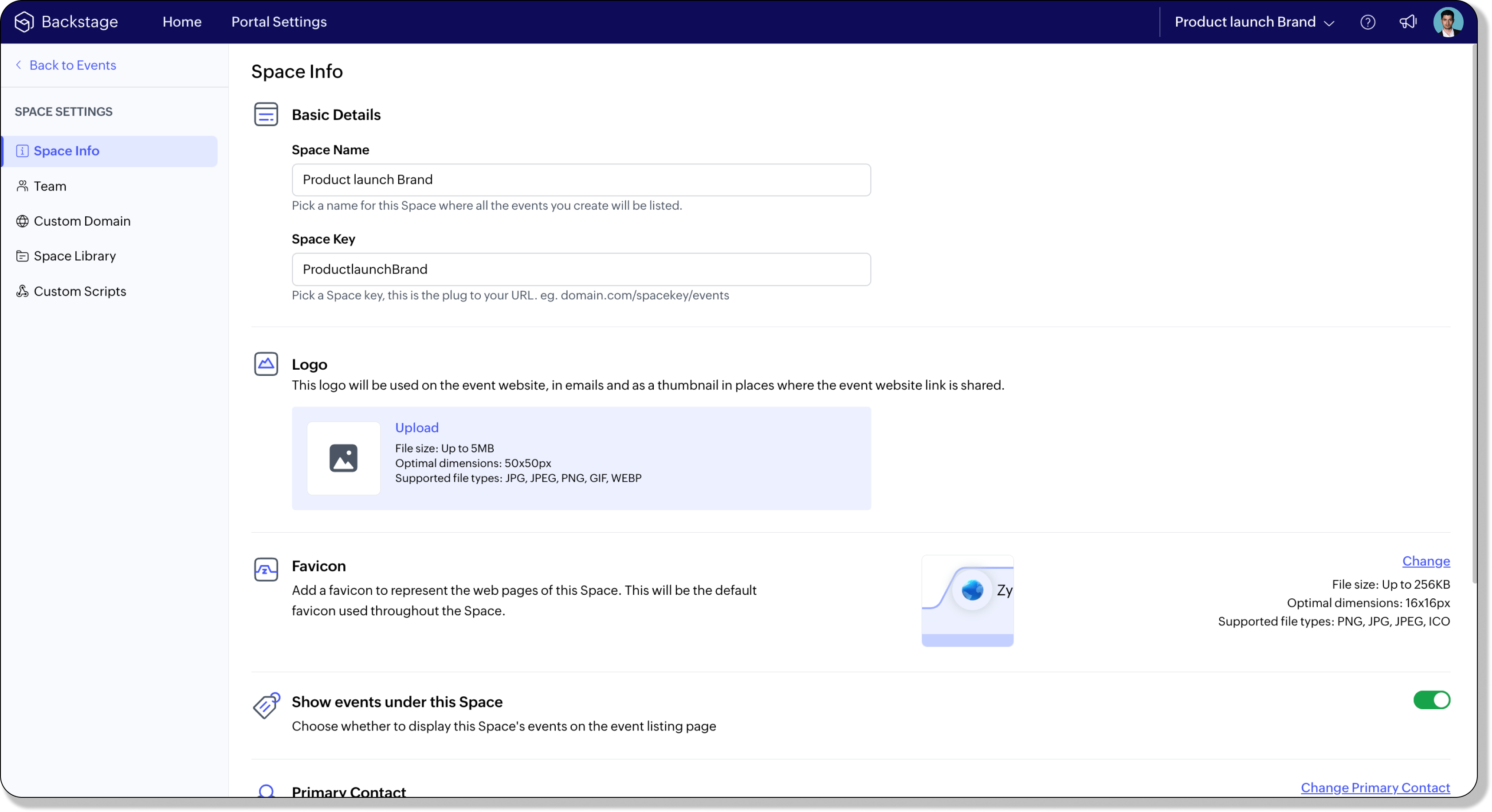 Zoho BackstageのSpaceは、すべてのイベント関連のカスタマイズとブランディングについての中心的なハブとなります。これはあなたのイベントの設定のコンテナとして機能し、イベントの名前、ロゴ、チームメンバー、支払い、その他の重要な要素のパーソナライズを可能にします。各Spaceは一意のSpaceキーキーとリンクされ、イベントを別々に識別します。