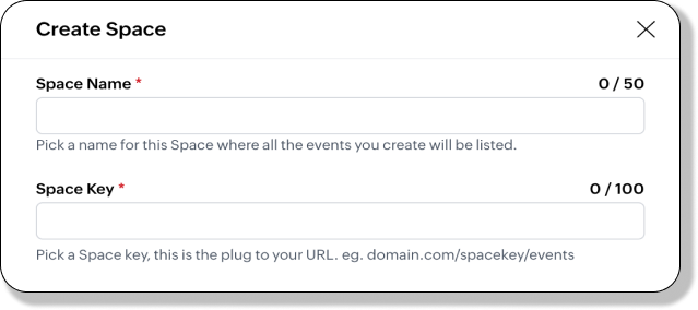 2. Spaceキー:SpaceキーはZoho Backstageが使用するユニークな識別子であり、あなたのイベントがほかのものから際立つようにします。 キーはSpaceを作成するときに自動的に作成されますが、あなたの要件に応じて更新することも可能です。
