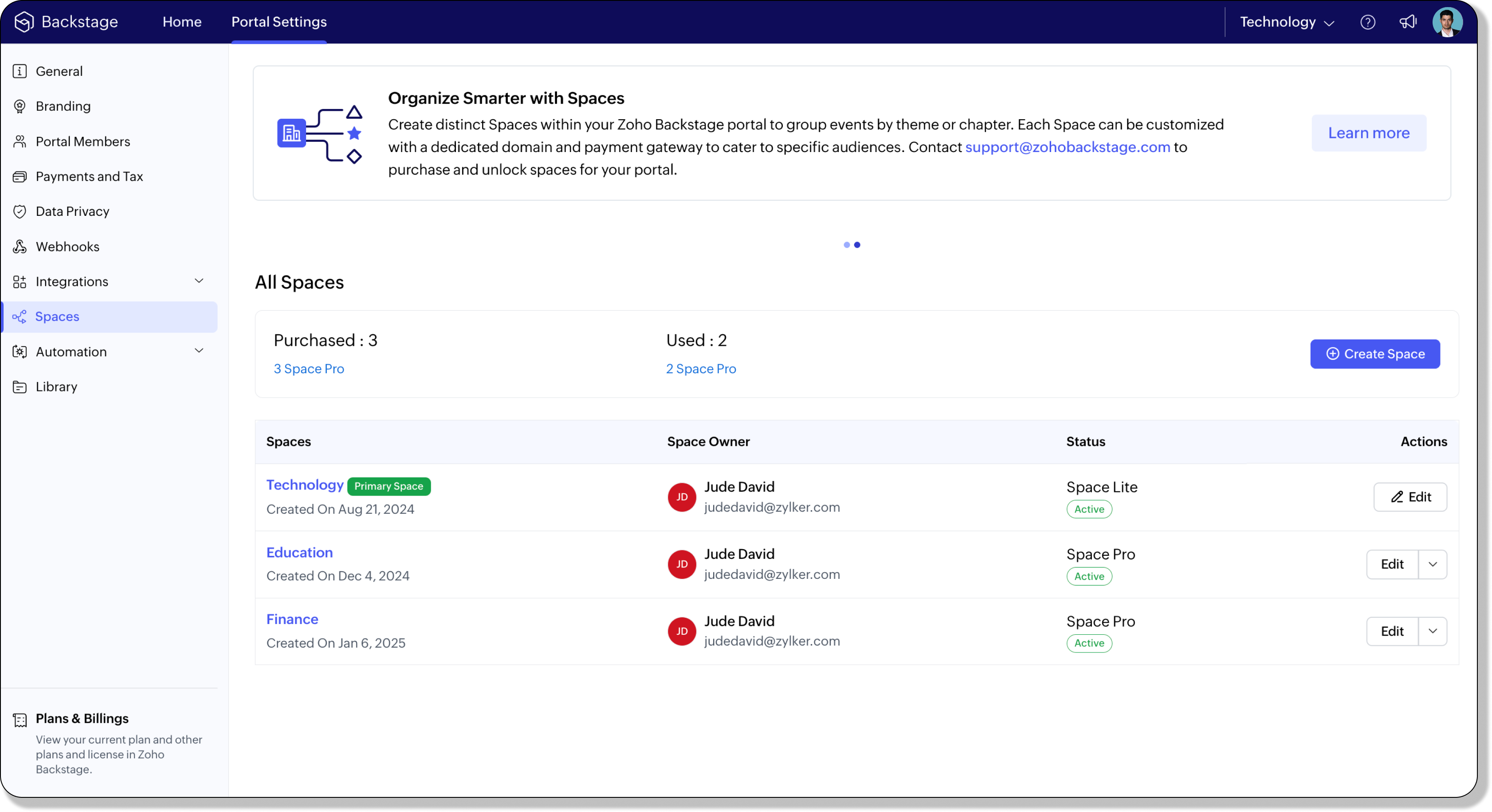 1. 追加のスペースを作成するには、サポート@zohobackstage。comに連絡して、スペース追加オンを購入する必要があります。