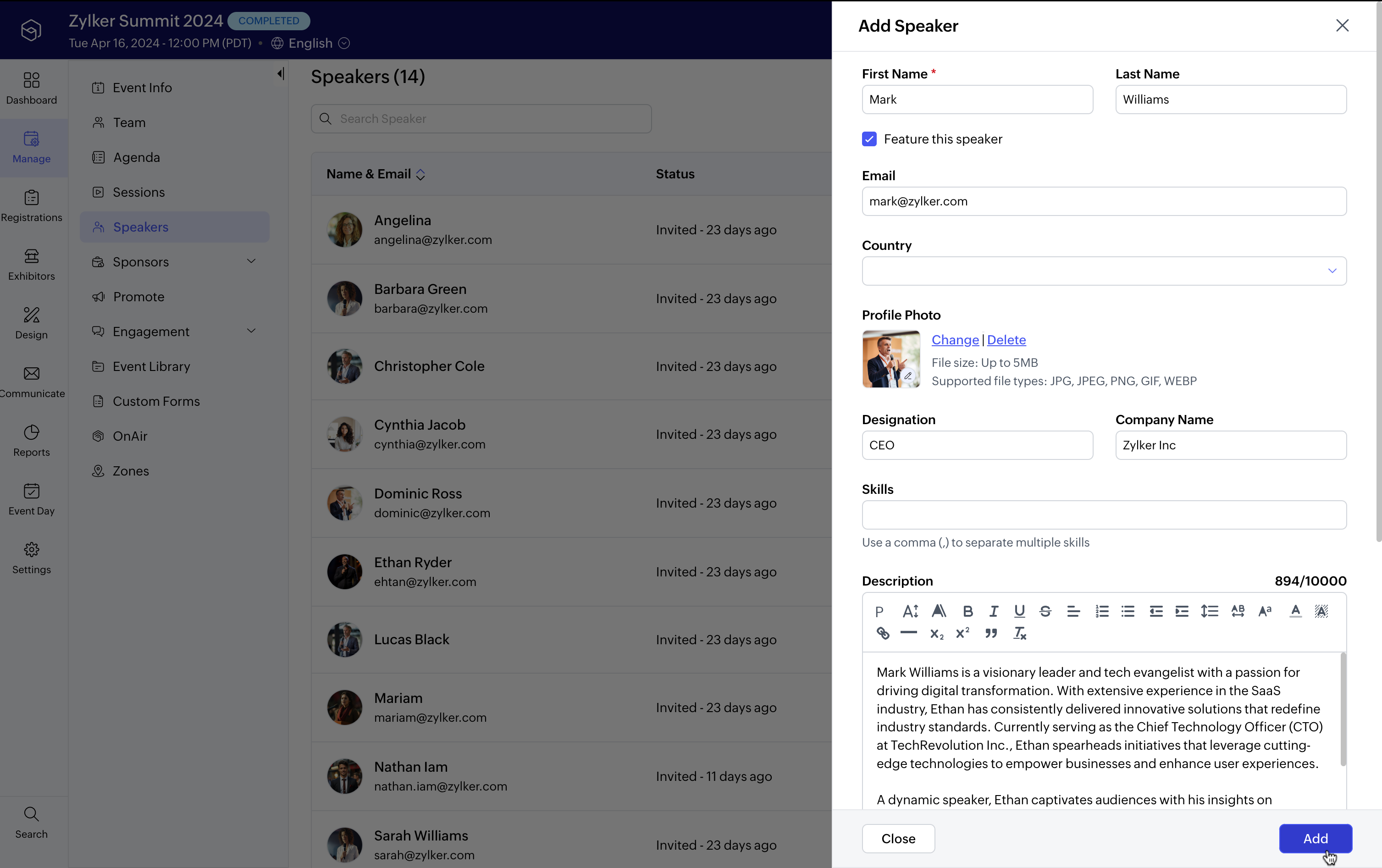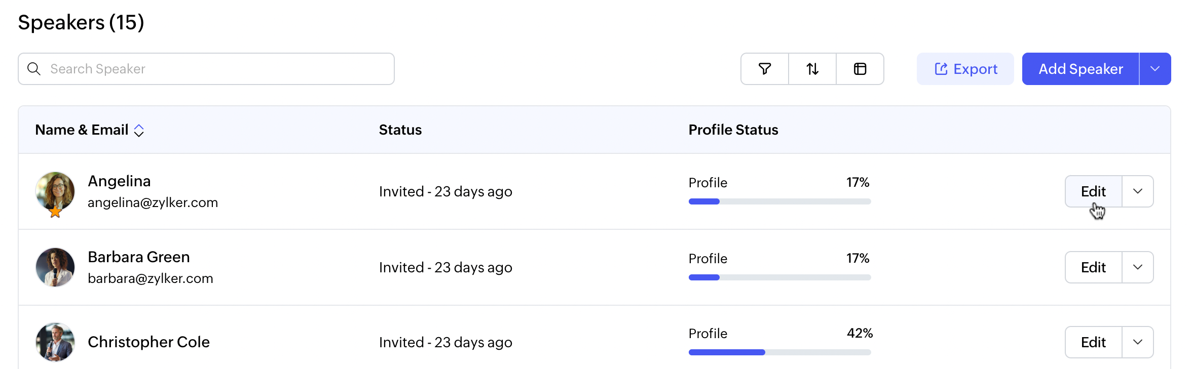 イベントにスピーカーを招待して、全員が参加できるようにしましょう。スピーカーの経歴やスキルが参加者に分かりやすいよう、魅力的なプロフィールを追加してください。