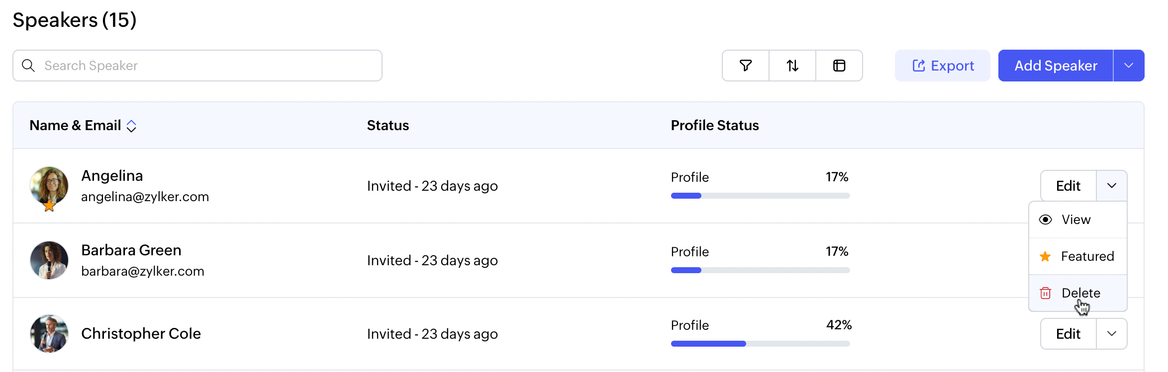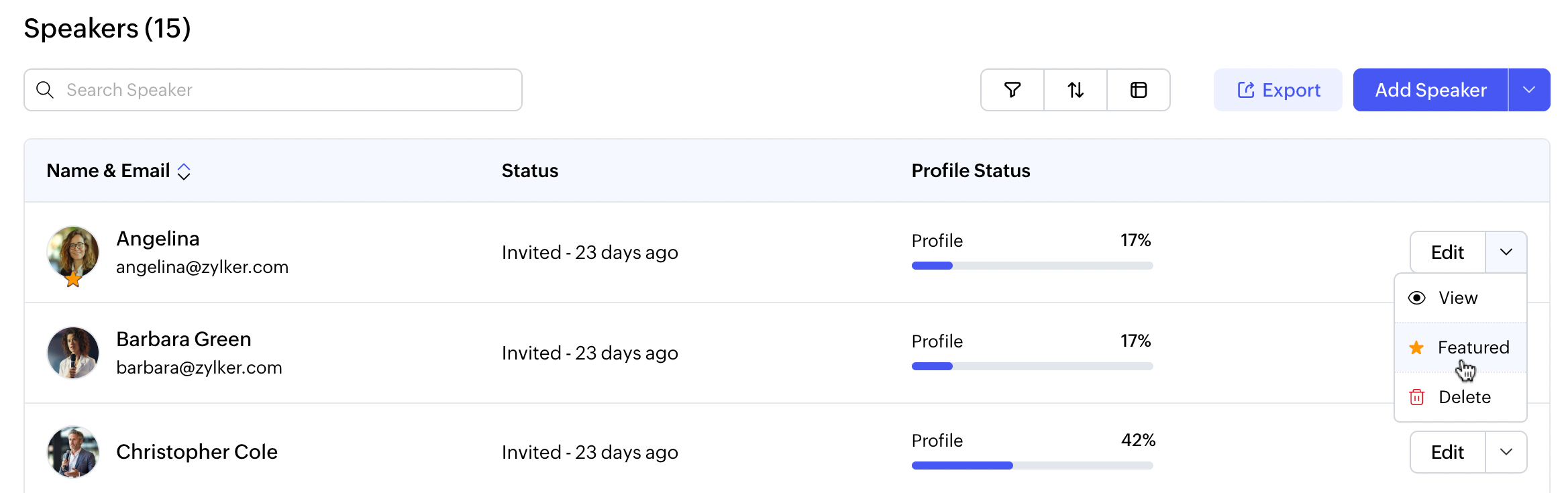 2. 特集したいスピーカーのドロップダウンメニューを開き、Featureをクリックします。特集されている場合はスターアイコンがオレンジ色に変わります。