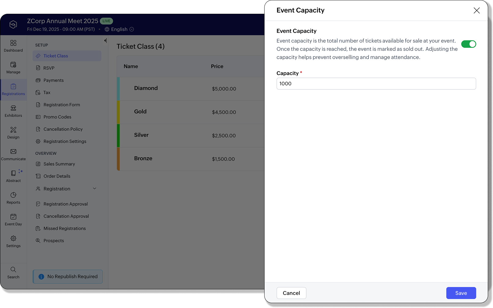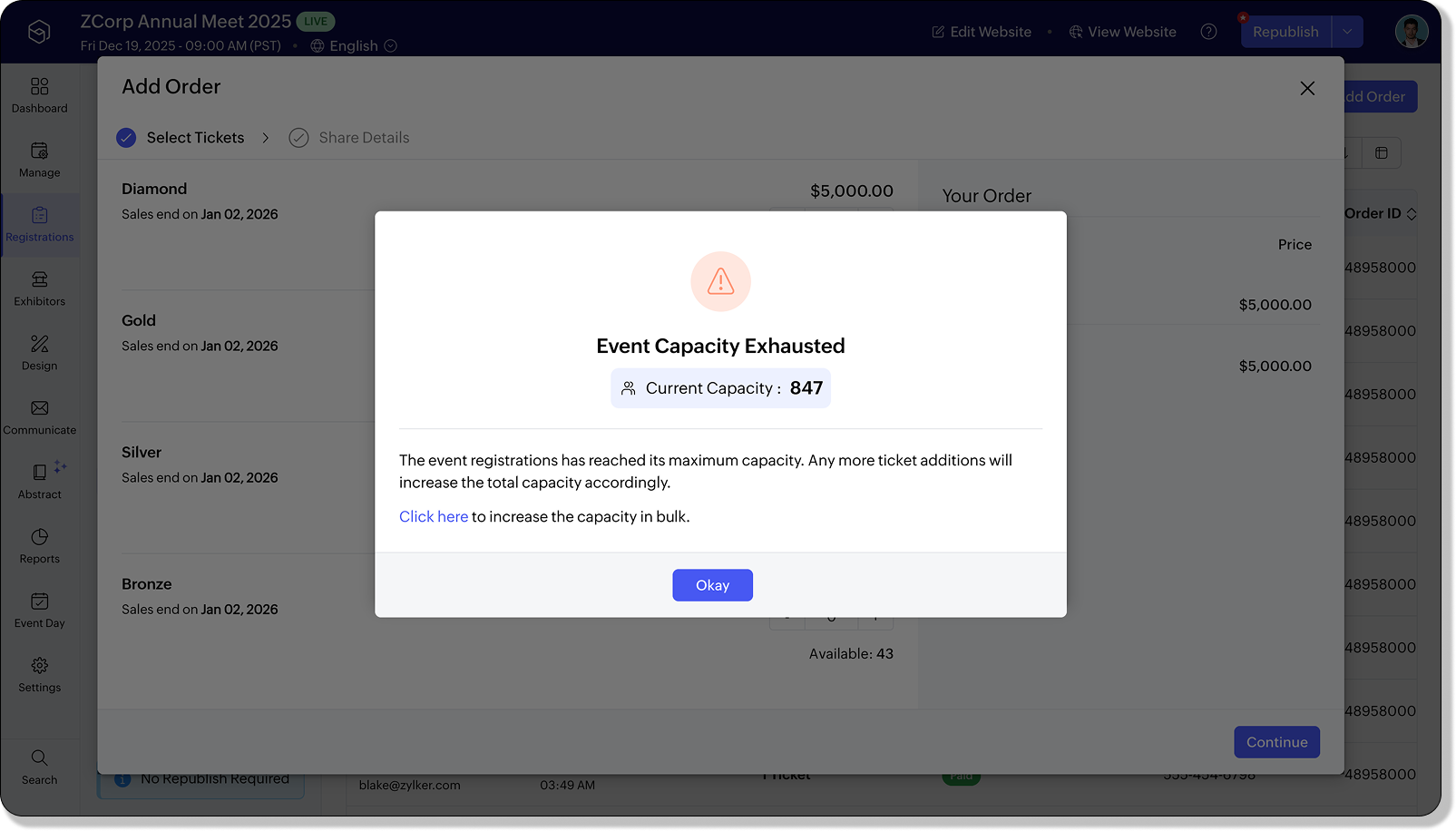 1. 承認によって合計登録数がイベントの定員を超える場合、Zoho Backstageは注意メッセージを表示します。
