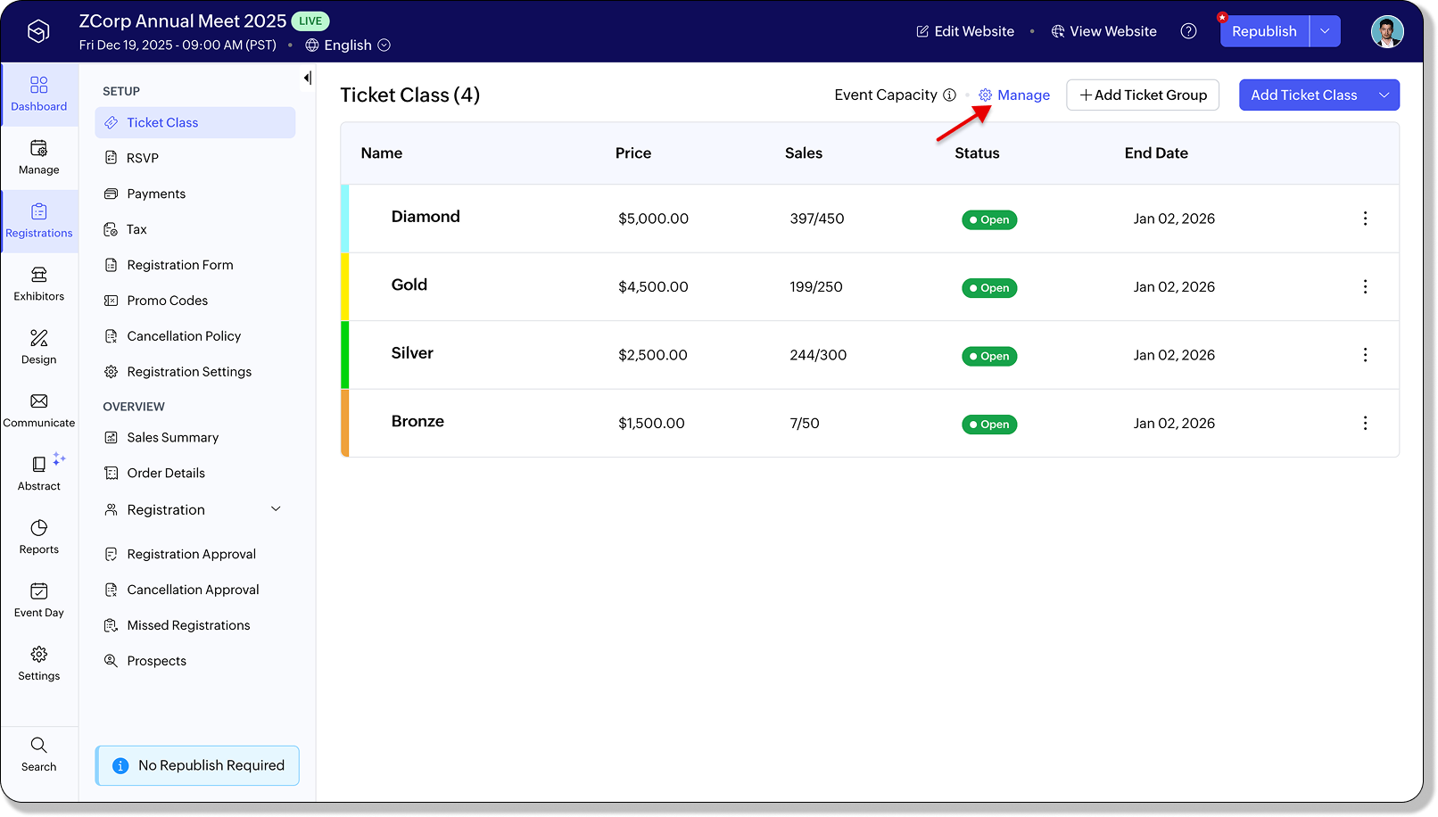 1. イベント定員はすべてのチケットクラスを合計して適用されるため、参加者上限が販売チャネル全体で確実に守られます。