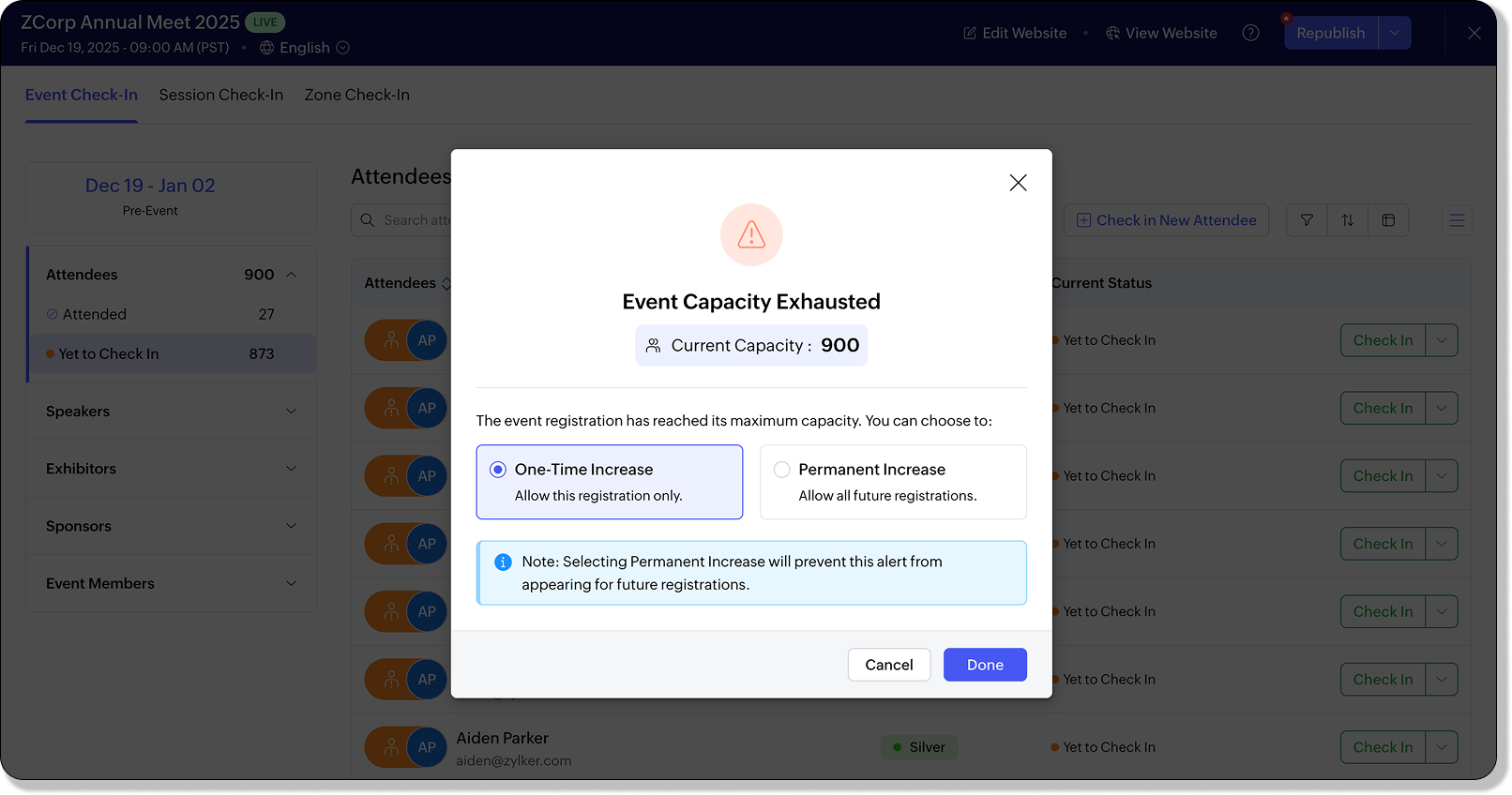 定員に達した際、Zoho Backstageはチェックイン時(ウェブおよびモバイルの主催者アプリ両方)に注意を表示します。次のいずれかを選択できます: