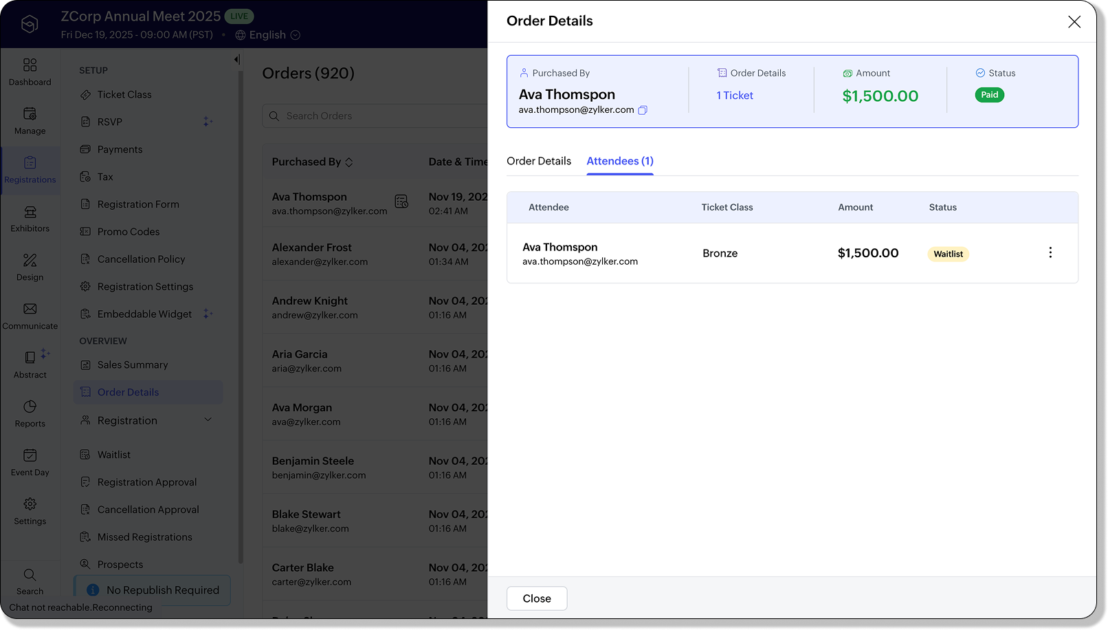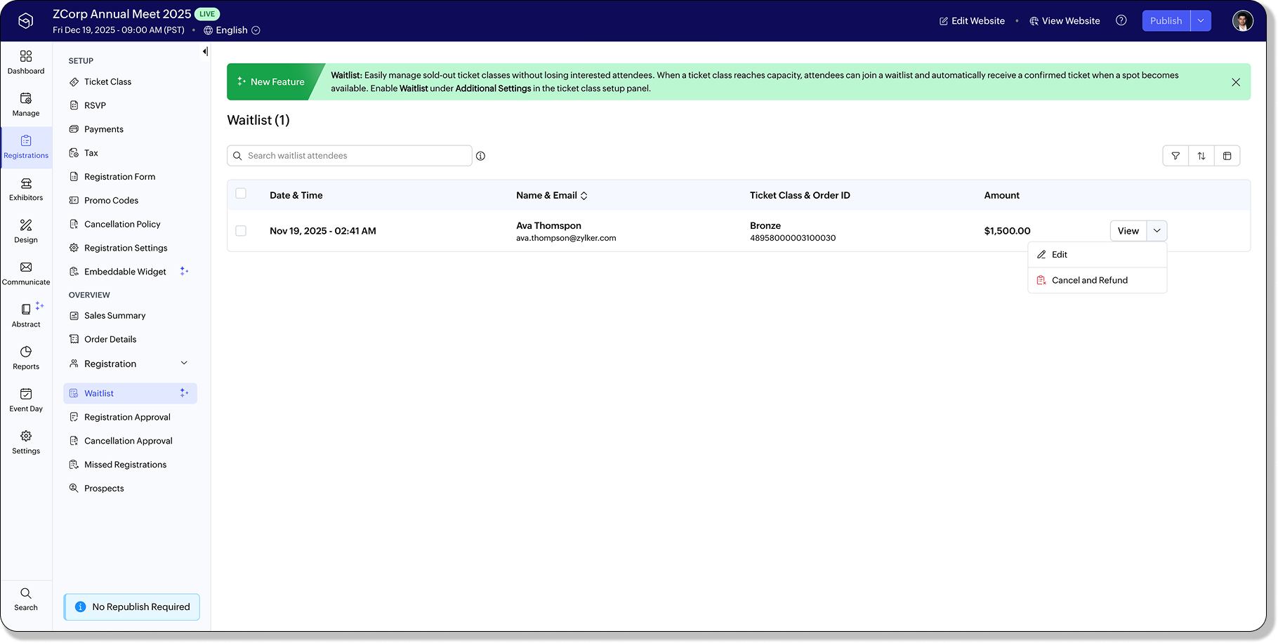 ウェイトリストを有効にすると、登録セクションに[ウェイトリスト]タブが表示されます。