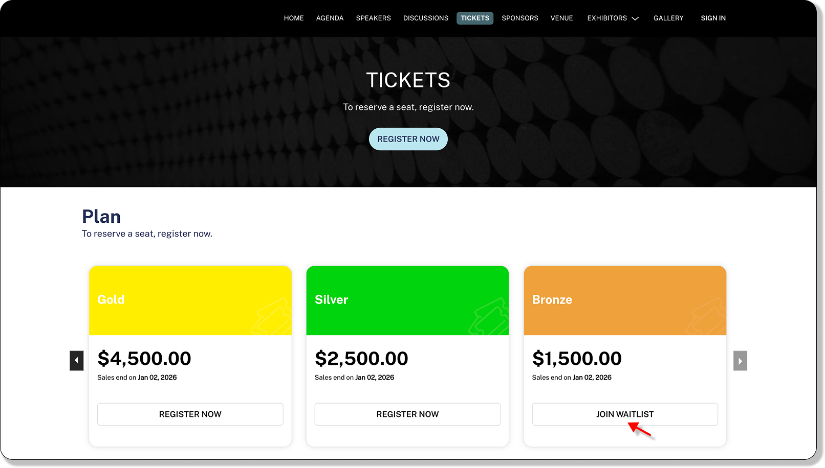 イベントのチケットクラスが上限に達すると、イベントサイトにボタンが表示されます。