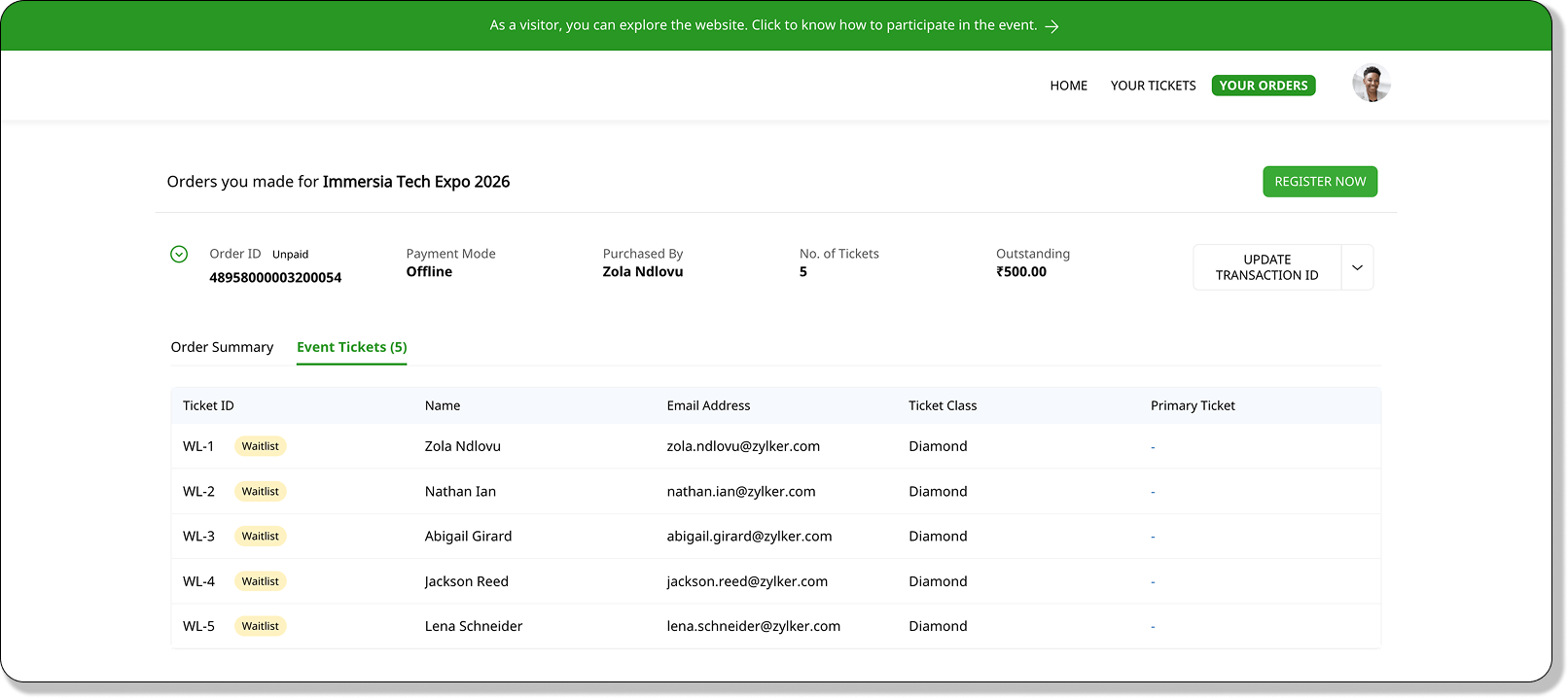4. 複数のチケットを購入している場合、注文ページで、どのチケットが確定済みで、どのチケットがウェイトリスト中かが明確に表示されます。