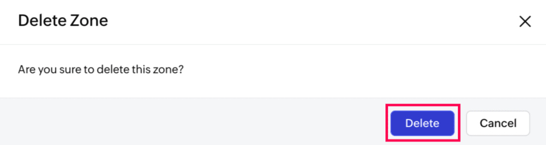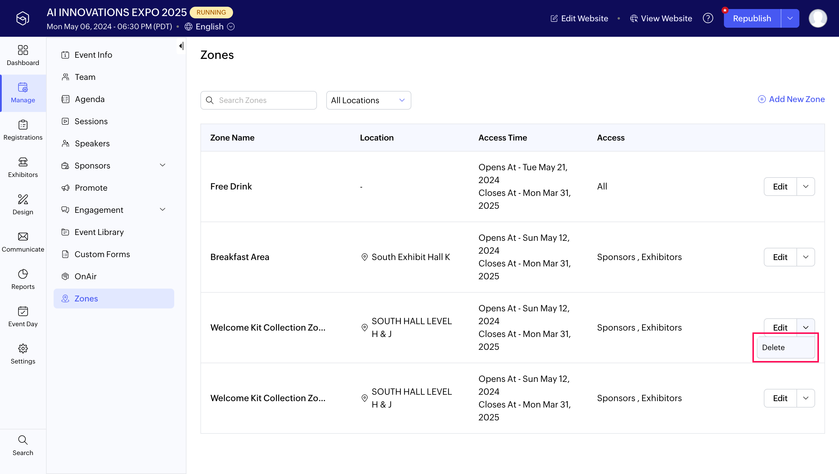 Zoho Backstage では、作成済みのゾーンをイベントの終了日時より前、または不要になった場合にいつでも削除できます。