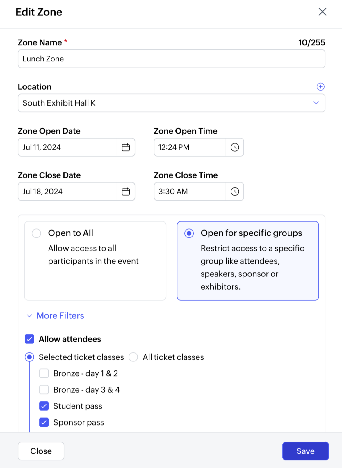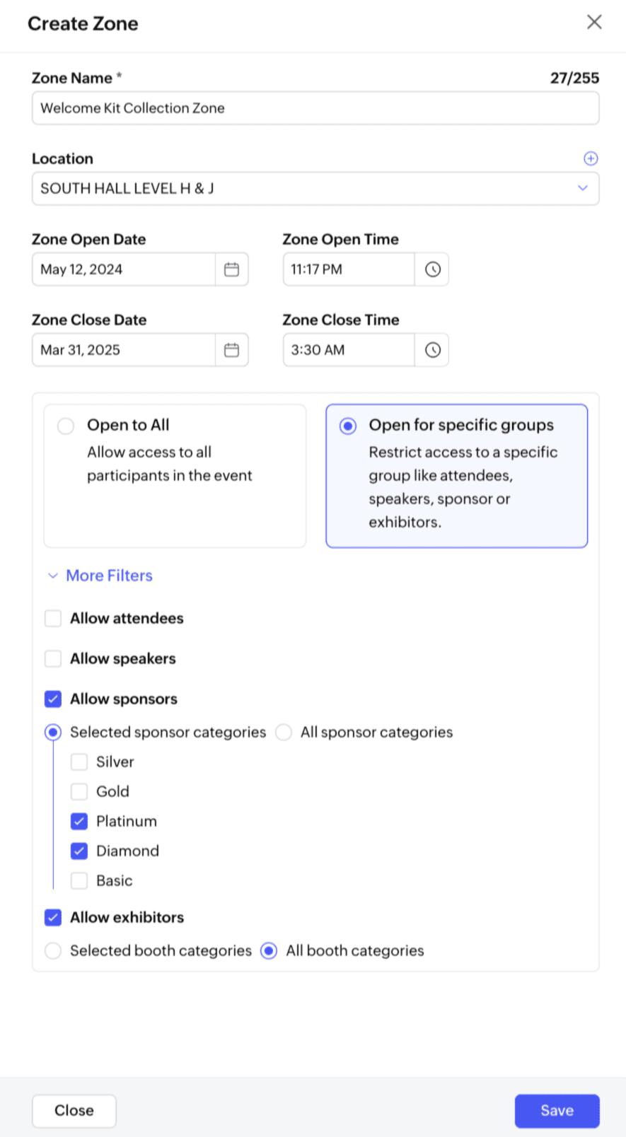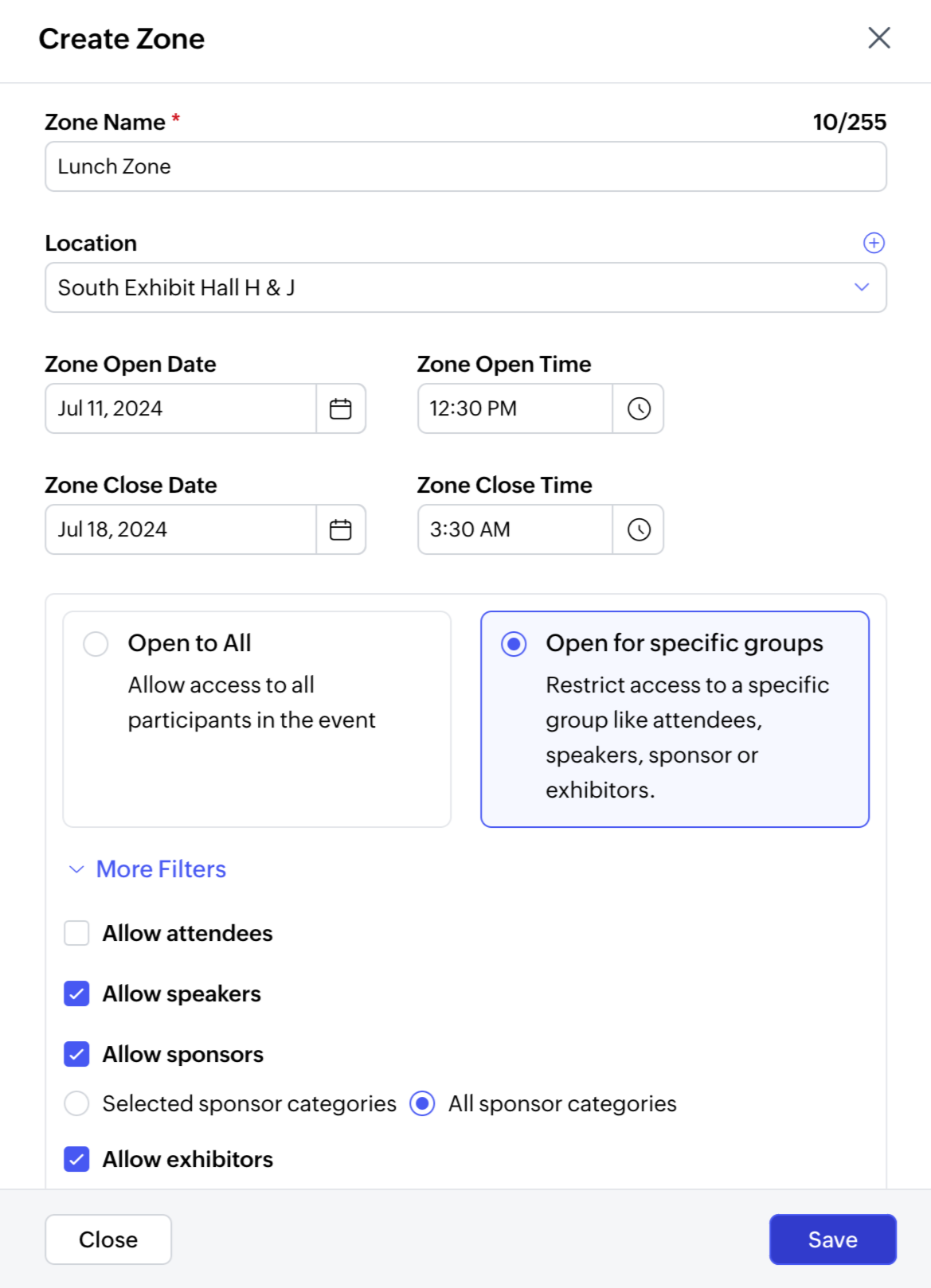 開く to すべてをクリックすると、すべての参加者がイベントZoneに入場できます。特定のグループのみを入場可能にしたい場合は、開く to Specific Groupsをクリックし、入場を許可するグループを選択してください。