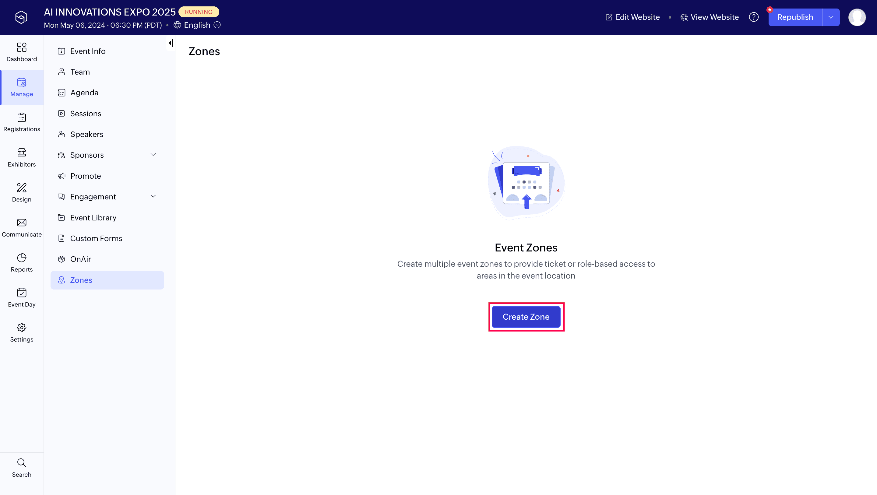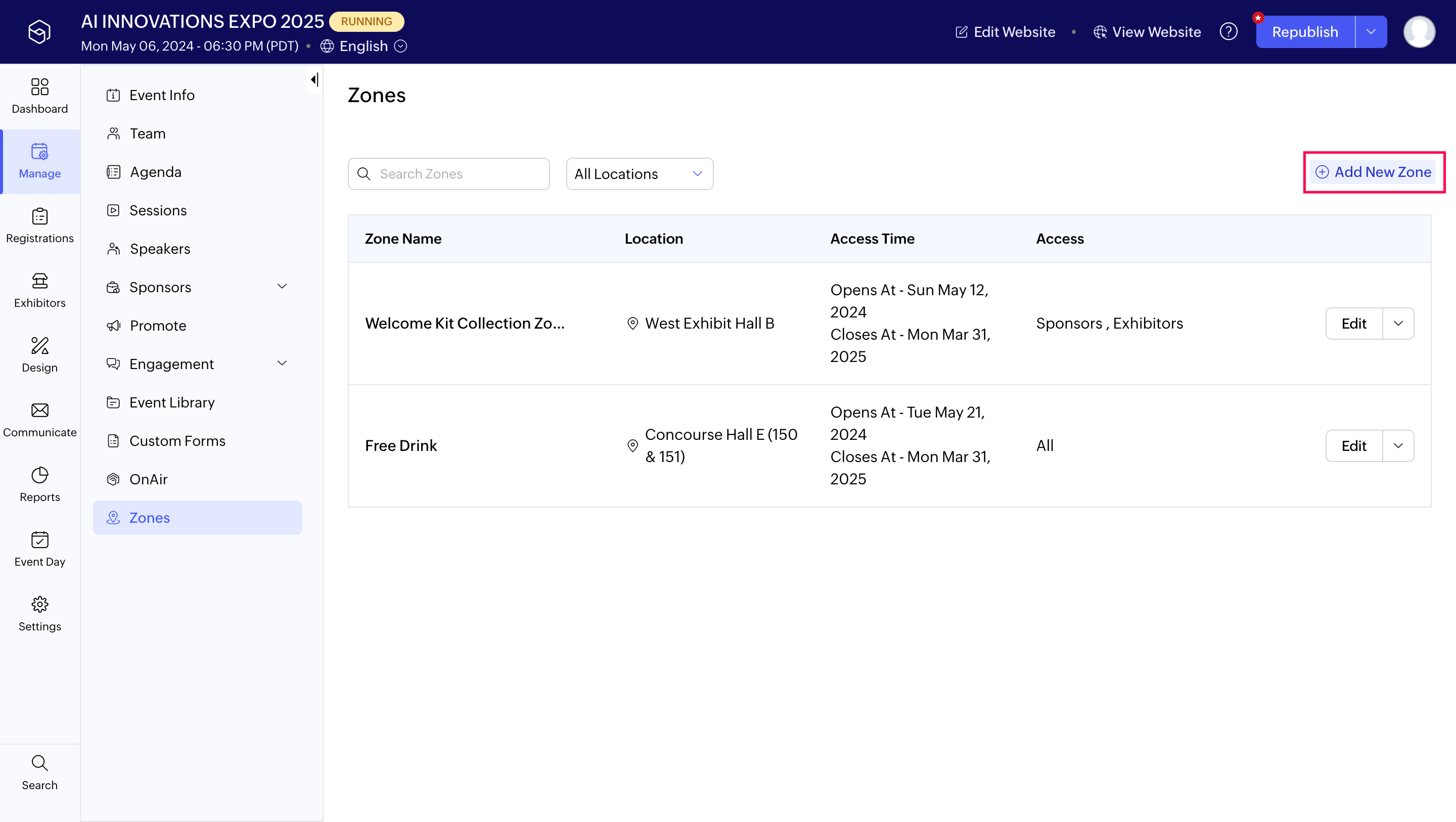 Zoho Backstageでは、イベントが有効になる前であればいつでも柔軟に新しいZoneを追加でき、ニーズに合わせた包括的なイベント計画が可能です。