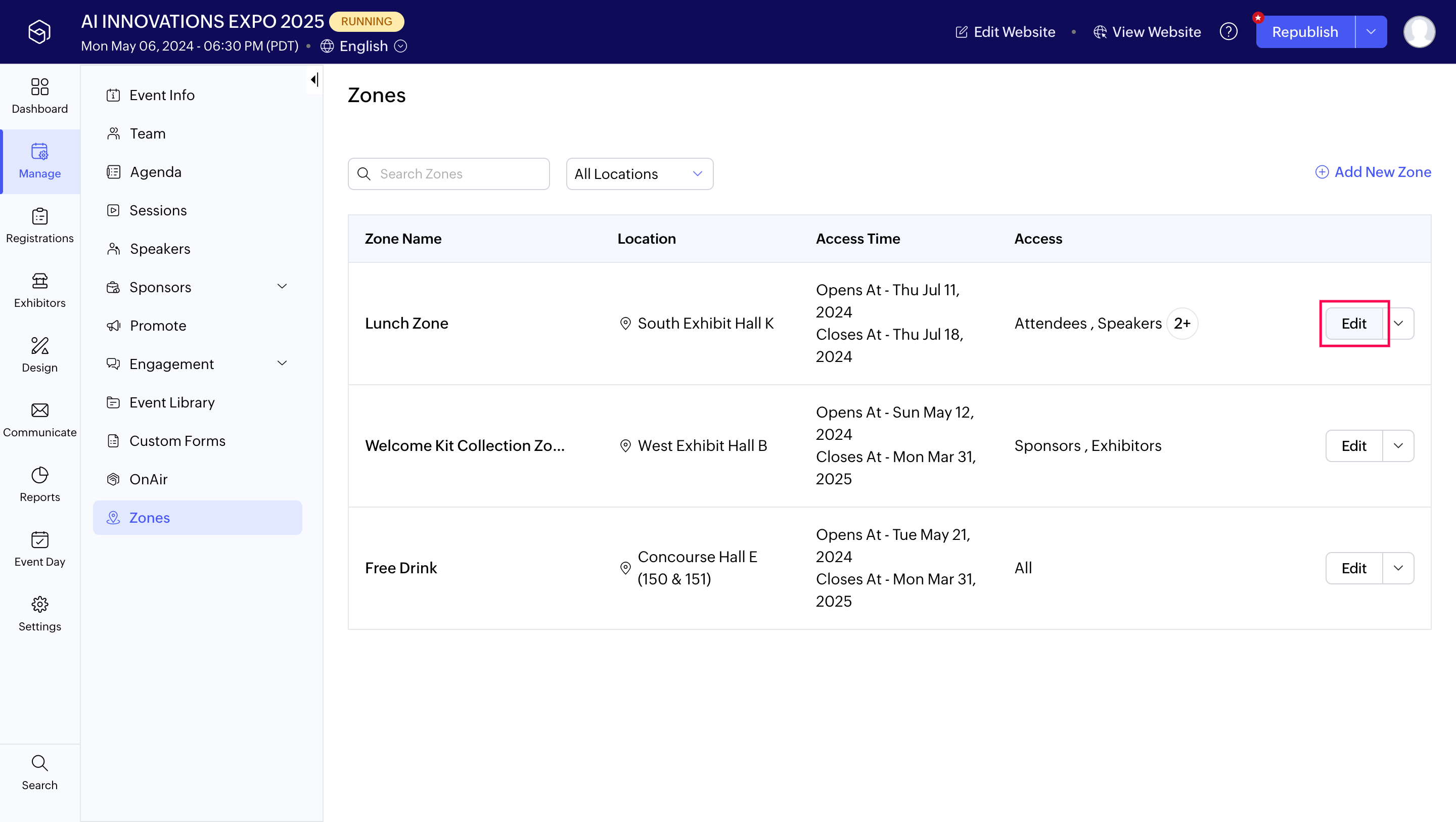 Zoho Backstage では、必要に応じてゾーン情報やゾーンの各種設定を編集できます。これにより、イベント運営を正確に行い、変化する要件にも柔軟に対応できます。ゾーンに対して次の変更が可能です:
