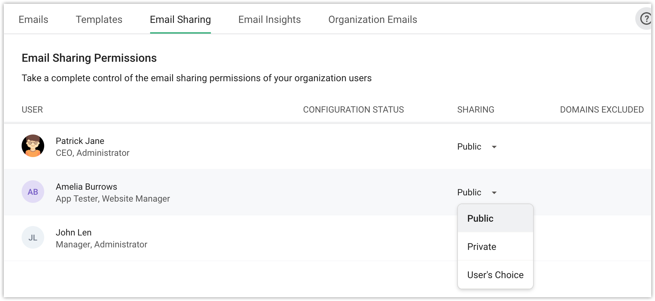 ユーザーは自分のメールを組織内の他のユーザーとBiginアカウントで共有することができます。すべてのメールを共有するか、非公開にするかを選択することが可能です。