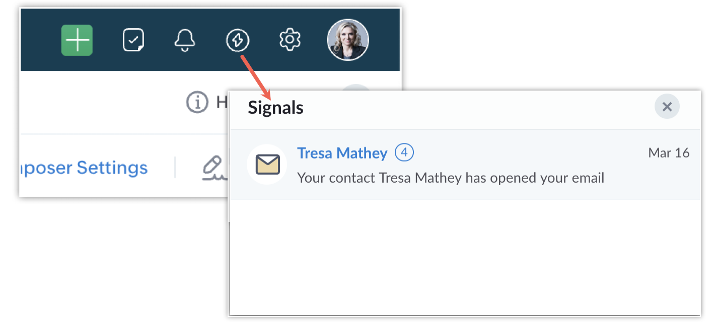 Signalsは、Xでのメンション、連絡先がメールを開封した時、通話を逃した時など、連絡先のタッチポイントを通知します。これらの通知には、Signals詳細ページから直接対応できます。