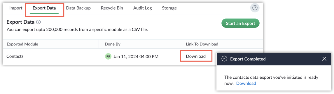 2. エクスポートするリンクは7日間有効で、リンクについてのポップアップ通知を受け取ります。また、データ管理ページでリンクを見つけることも可能です。