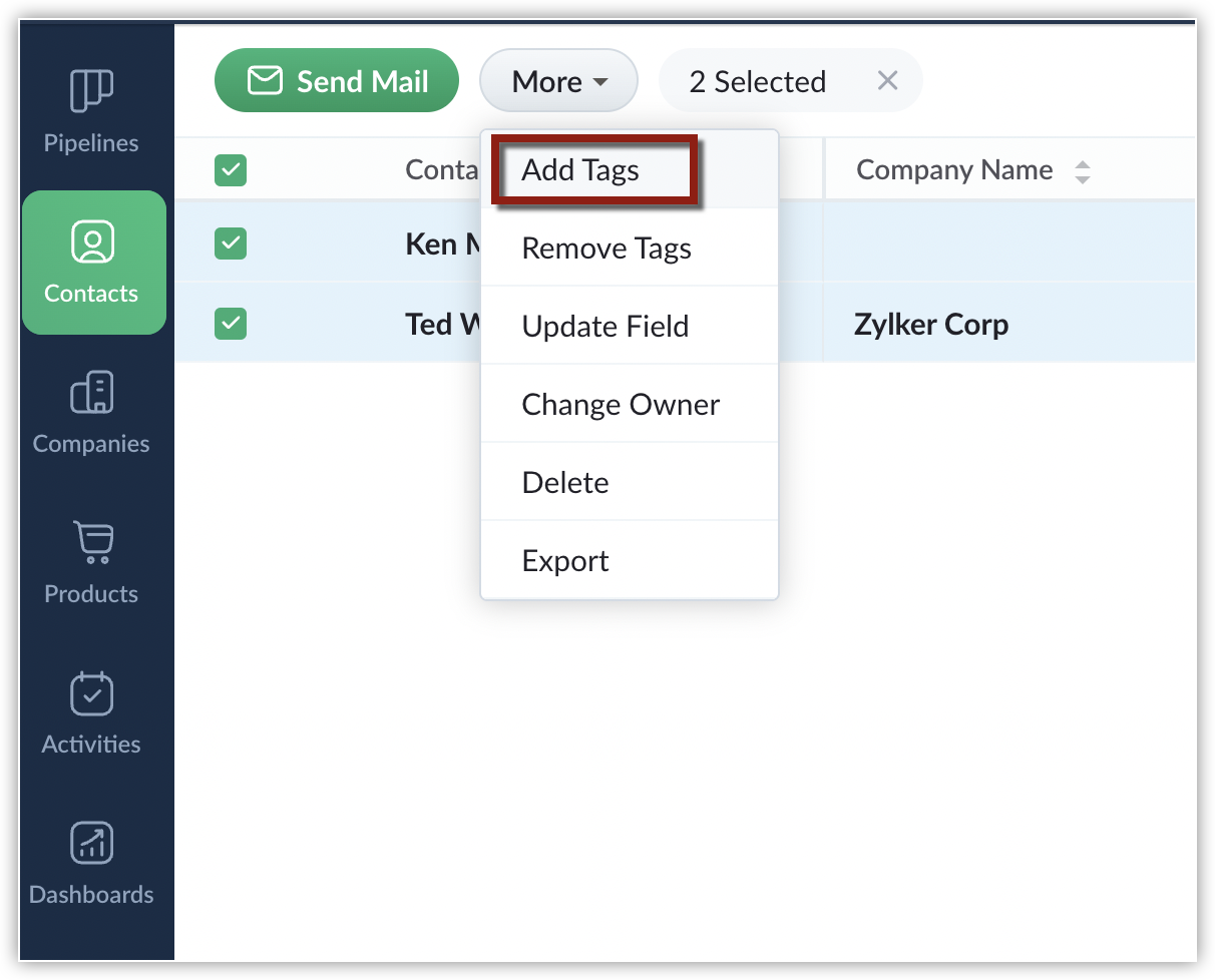 タグは、データを特定の特徴に基づいてタブ内で分類するためのラベルです。例えば、連絡先を法人との関係性で分類したい場合、「顧客」「prospects」「仕入先」などのタグを使用できます。データにタグを追加するには、