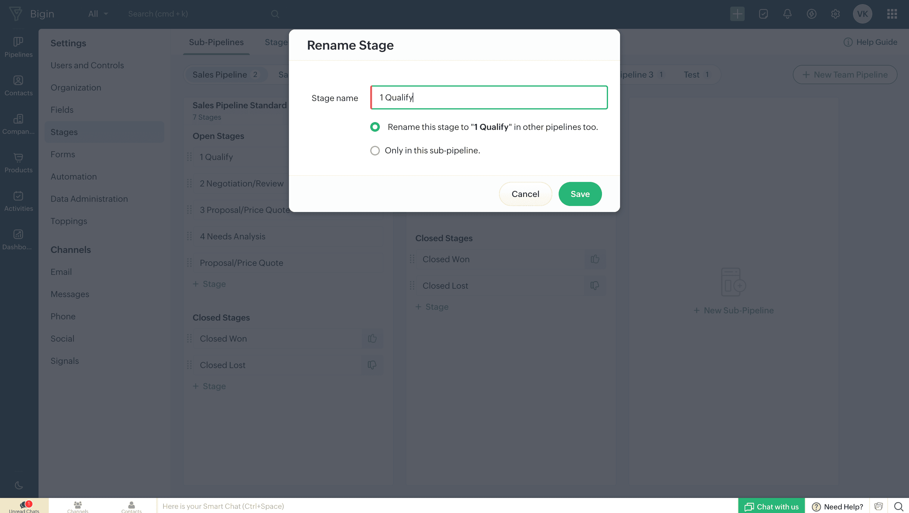 ステージの名前を変更する際、変更を現在のサブパイプラインのみに適用するか、アカウント内のすべてのパイプラインに適用するかを選択できます。