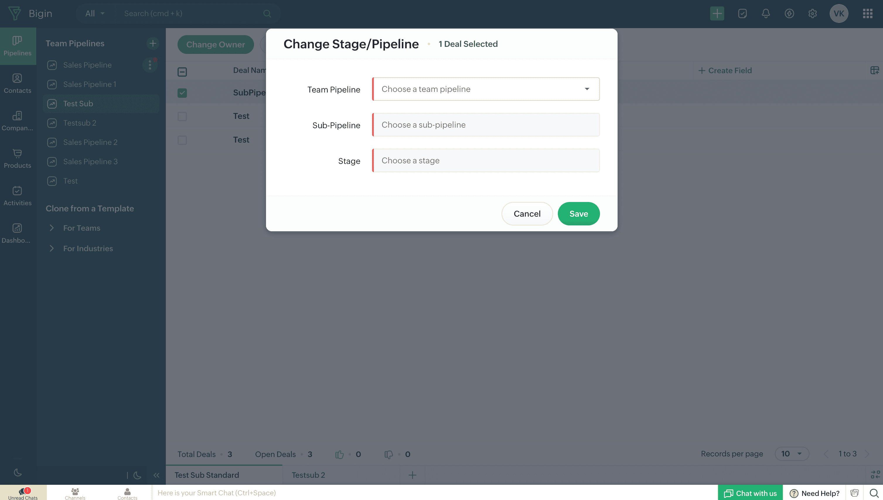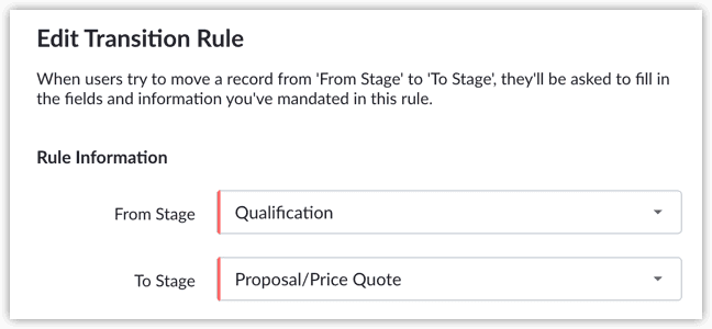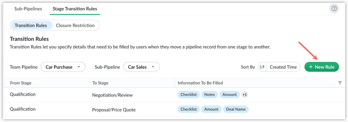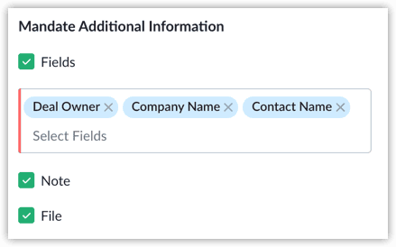 Zoho Biginのステージ遷移ルールでは、管理者がパイプライン内でデータをあるステージから別のステージへ移動する際に、ユーザーが必ず完了しなければならない必須の項目、メモ、ファイル、またはチェックリストを定義できます。これにより、パイプラインのプロセス全体で重要な情報が一貫して記録されるようになります。