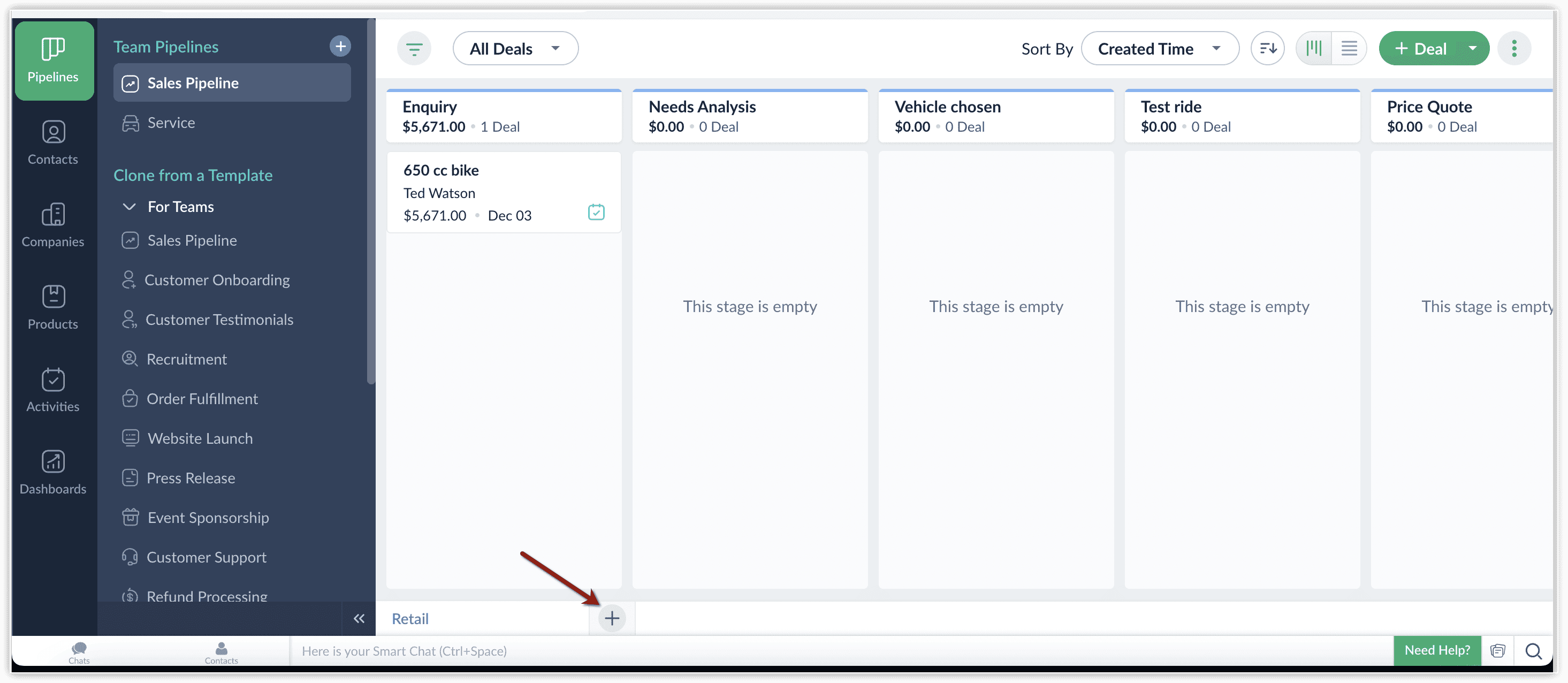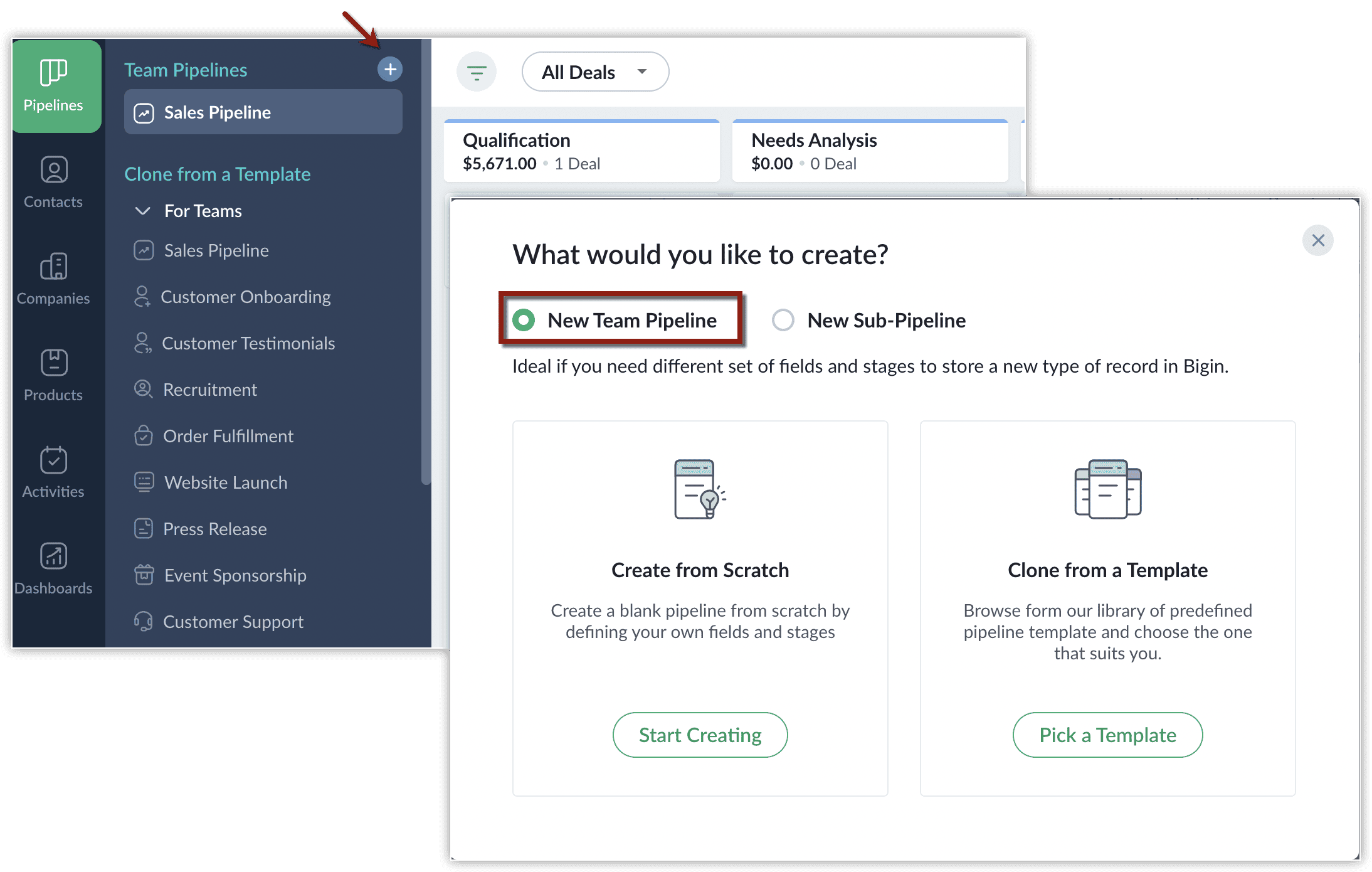 BiginのAdministrator権限を持つユーザーがTeam Pipelinesを作成できます。