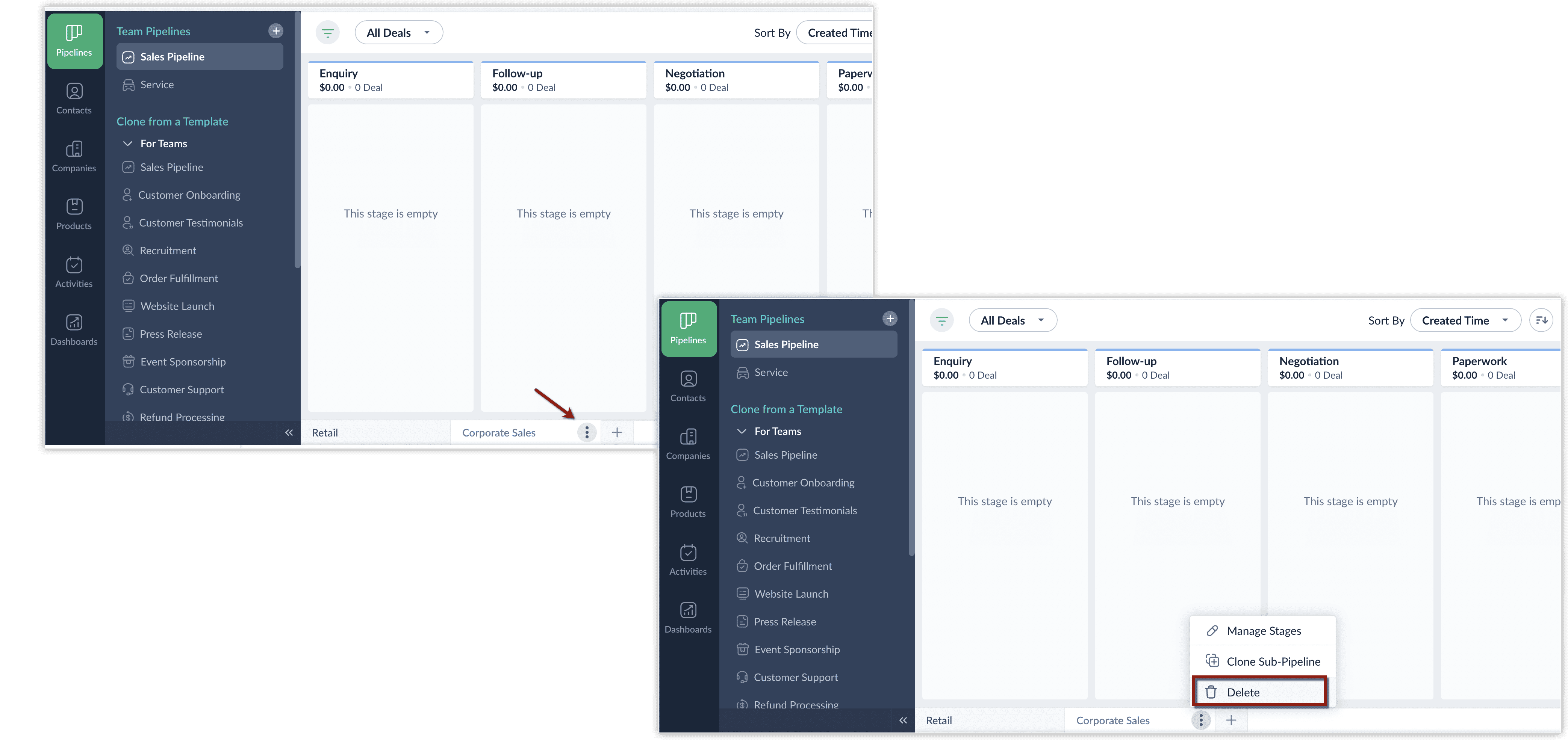 Team Pipelinesは、複数の法人プロセス(例:営業、サービス、返金、testimonials)を同一のBiginアカウントで管理できる多次元型のパイプラインです。各パイプラインには独自の項目、データタイプ、ステージ、アクセス権限を設定できます。