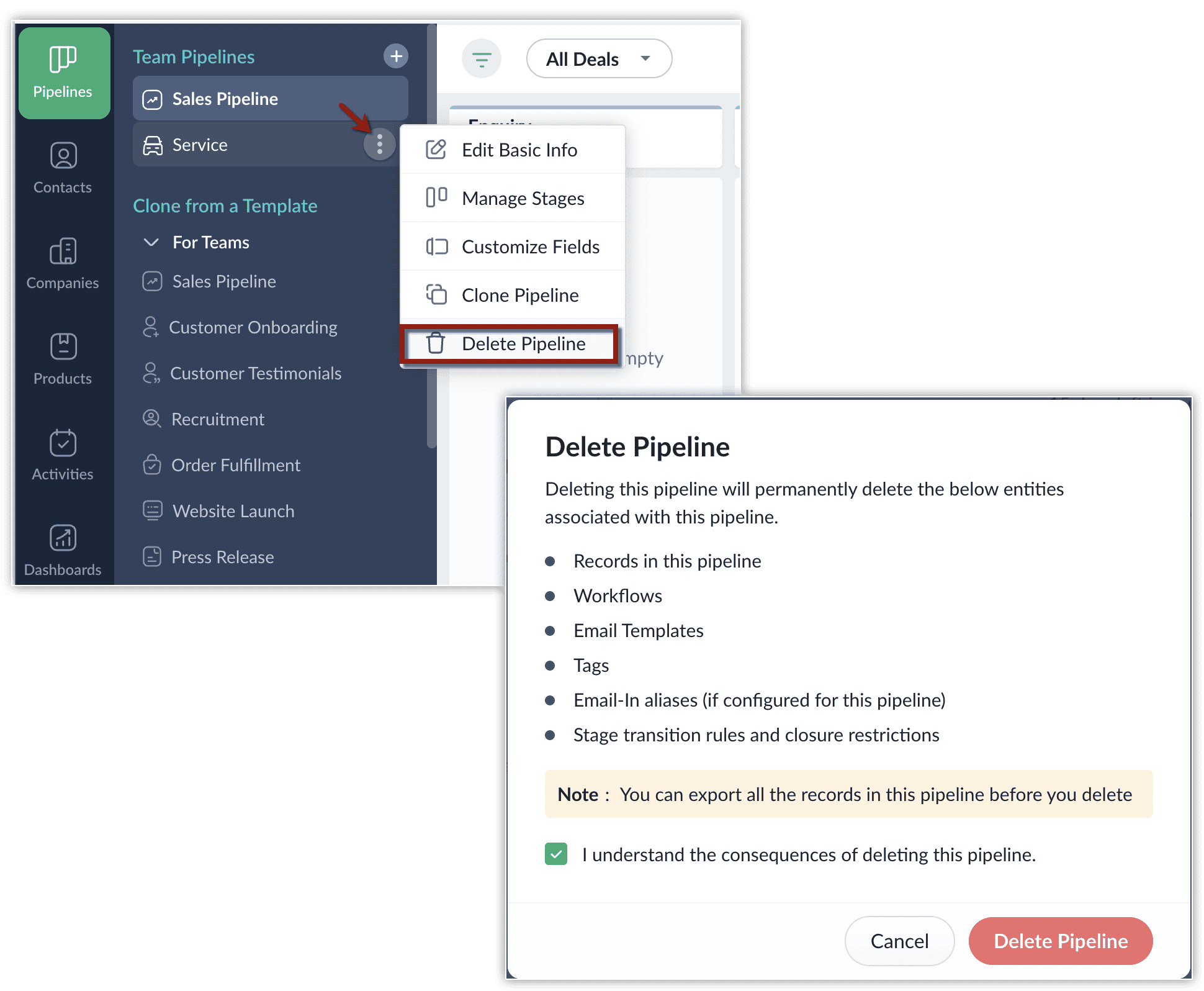 パイプラインを削除すると、その中のデータ、関連付け済みワークフロー、メールテンプレート、タグ、メールエイリアス(使用中の場合)、ステージ遷移ルール、クローズ制限などがすべて完全に削除されます。削除前にデータをエクスポートすることを推奨します。