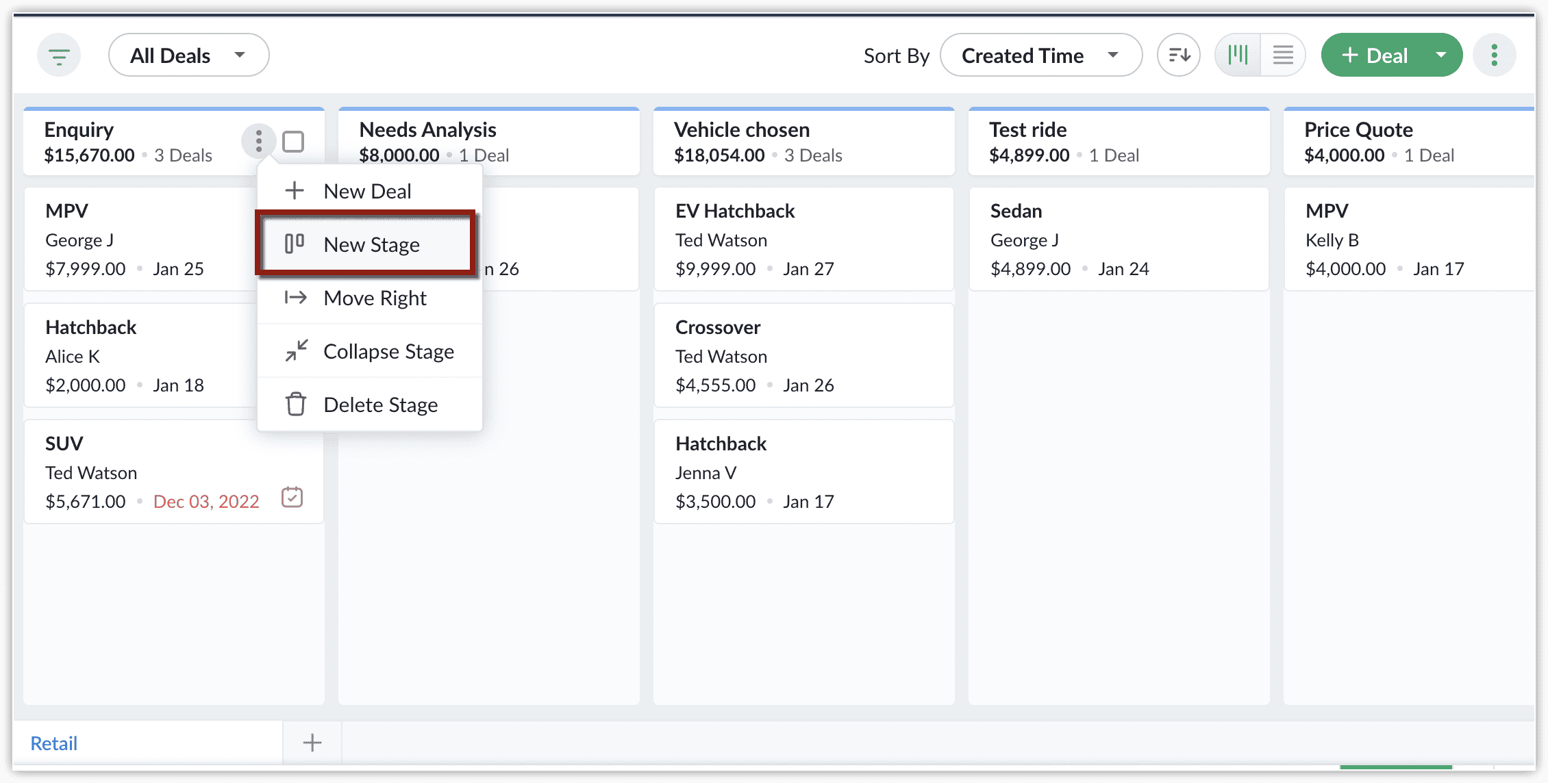 ステージは、パイプライン内の法人プロセスにおける各ステップを表します。各ステージでは、商談やサポートチケットなどのデータが、開始から完了までどの段階にあるかを追跡できます。ワークフローに合わせて、これらのステージをカスタマイズすることも可能です。