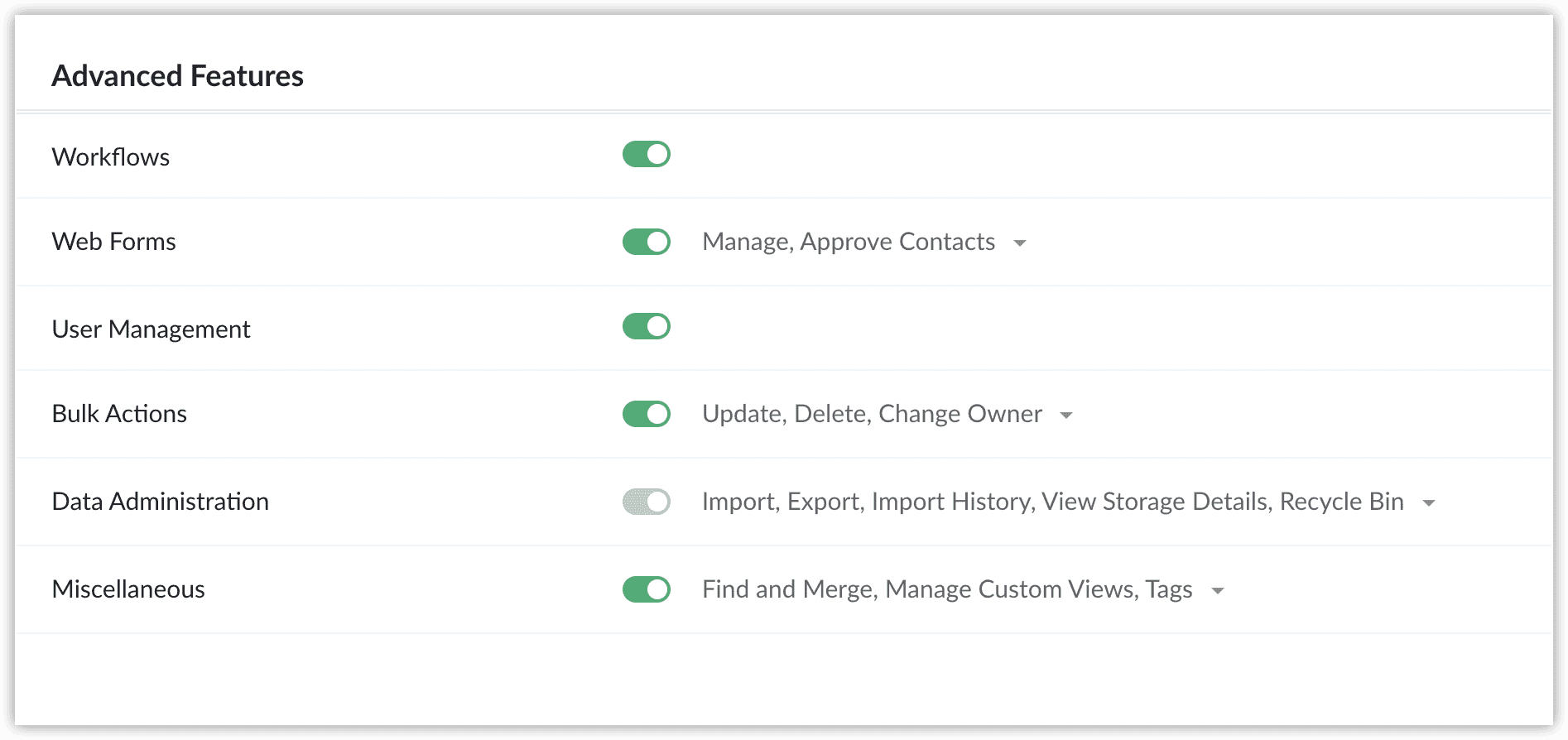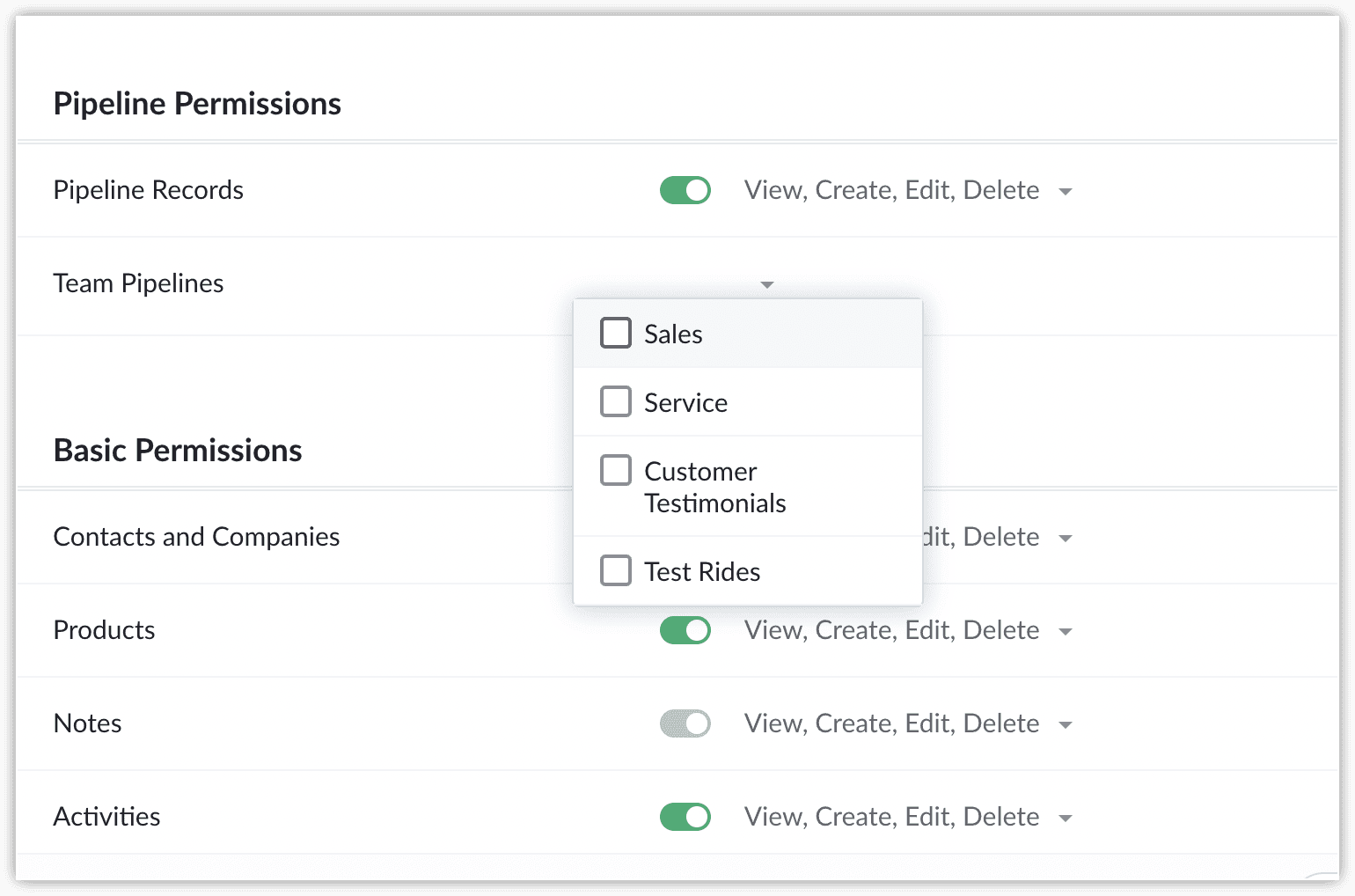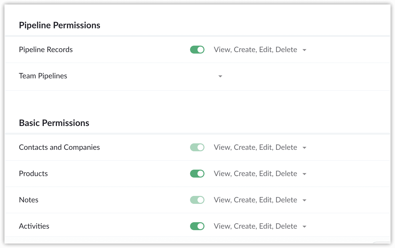 基本 権限: 連絡先、取引先、Pipelines、メモ、Files、活動、Dashboardsなどのタブごとに、「表示」「作成」「編集」「削除」の操作を有効または無効に設定できます。Dashboardsでは「表示」と管理権限のみサポートしています。