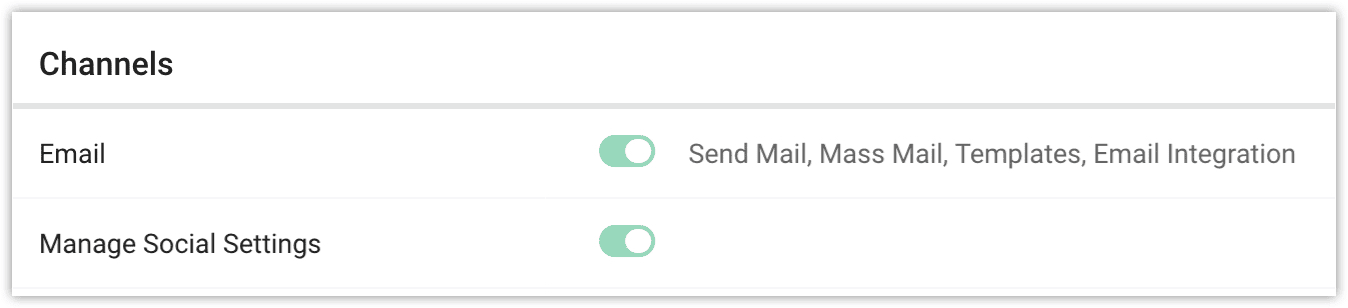 Channels 権限: メールやSocial権限などのコミュニケーションチャネルへのアクセスは、権限ごとに切り替えが可能です。
