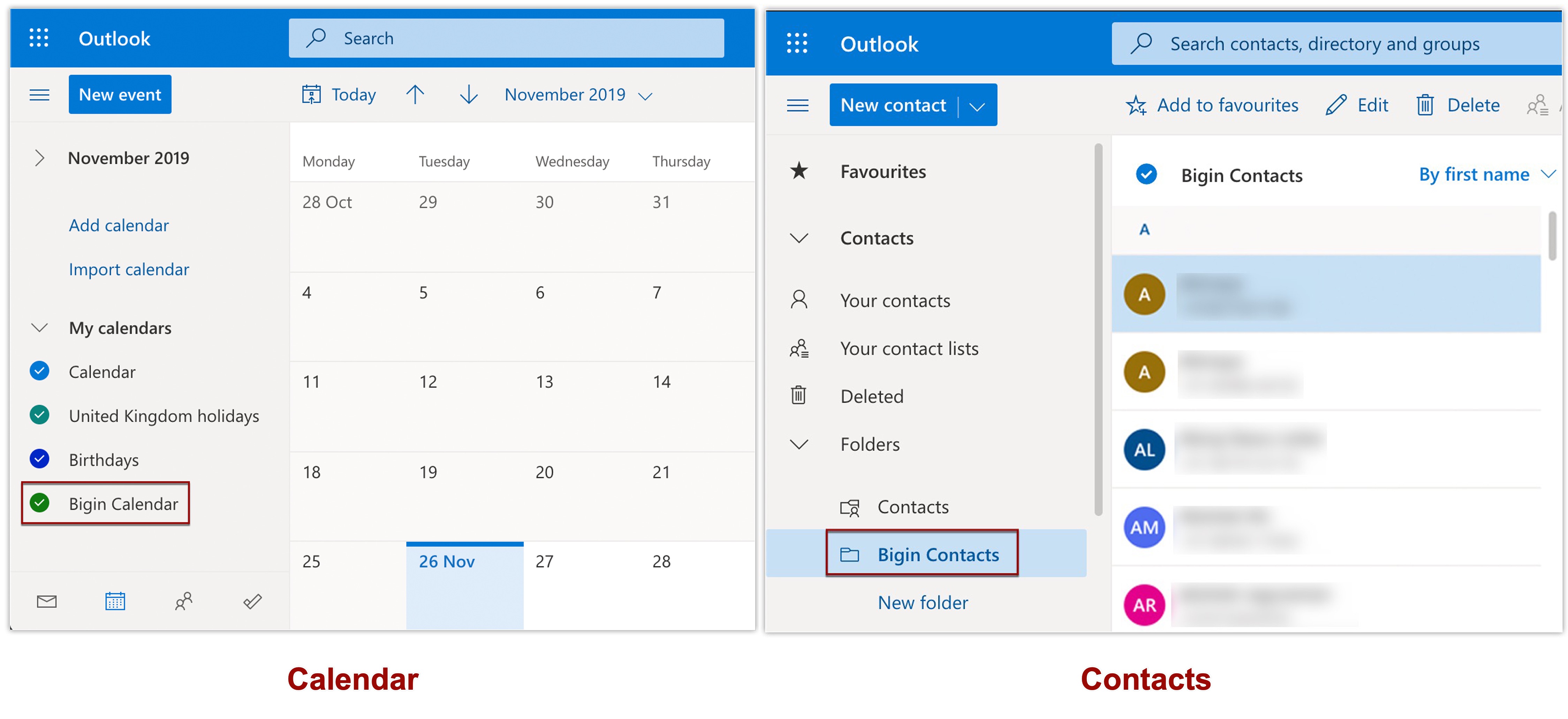 Microsoft 365アカウント/Outlookと統合すると、BiginカレンダーフォルダがMicrosoft 365/Outlookカレンダーに追加されます。同様に、BiginコンタクトフォルダがMicrosoft 365/Outlookの連絡先に追加されます。Biginからのすべてのカレンダーイベントと連絡先は、これらのフォルダで利用できます。