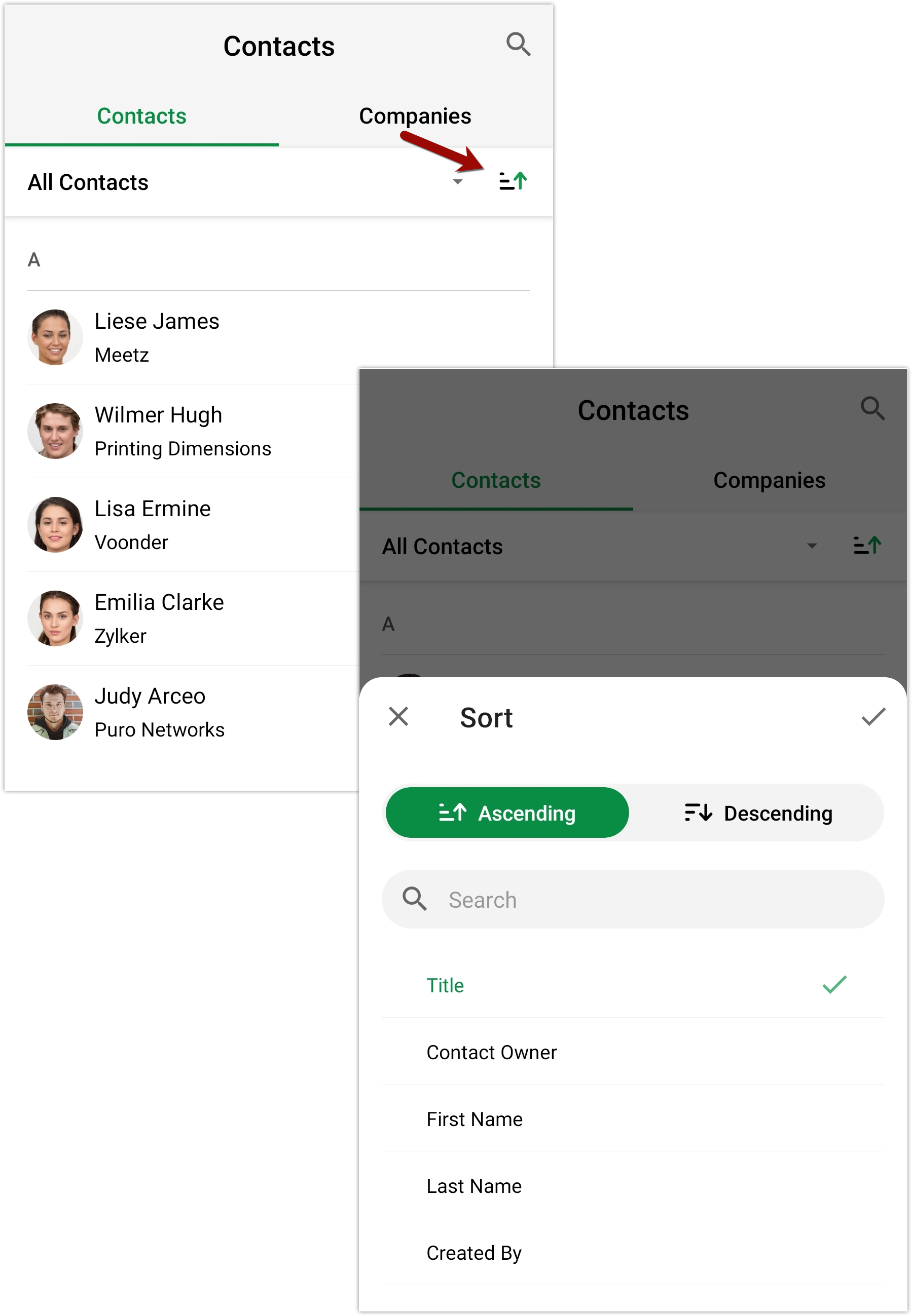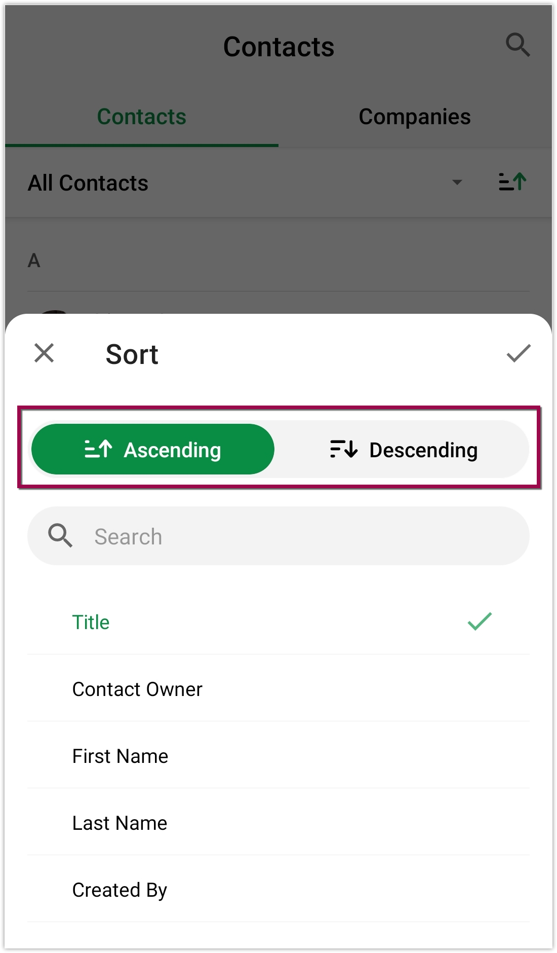 お知らせ:当社は、お客様により充実したサポート情報を迅速に提供するため、本ページのコンテンツは機械翻訳を用いて日本語に翻訳しています。正確かつ最新のサポート情報をご覧いただくには、本内容の英語版を参照してください。 レコードを並べ替えるには 1. iPhoneでBiginアプリを開きます。 2. 連絡先モジュールに移動します。 3. 画面の右上にあるソート アイコンをタップします。 4. リストから基準を選択してください。 5. レコードをソートする順序を選択します - 昇順または降順。 6. ...