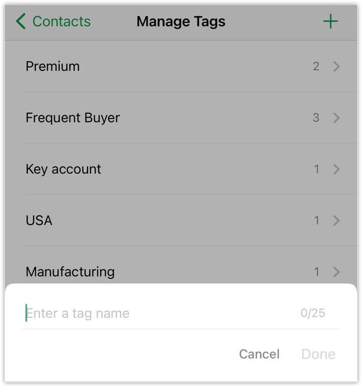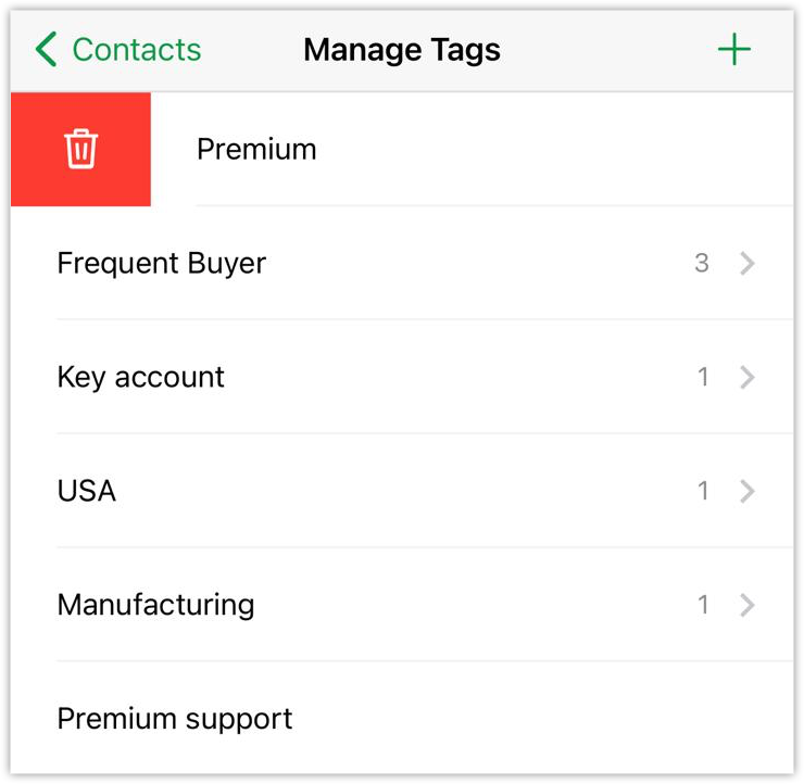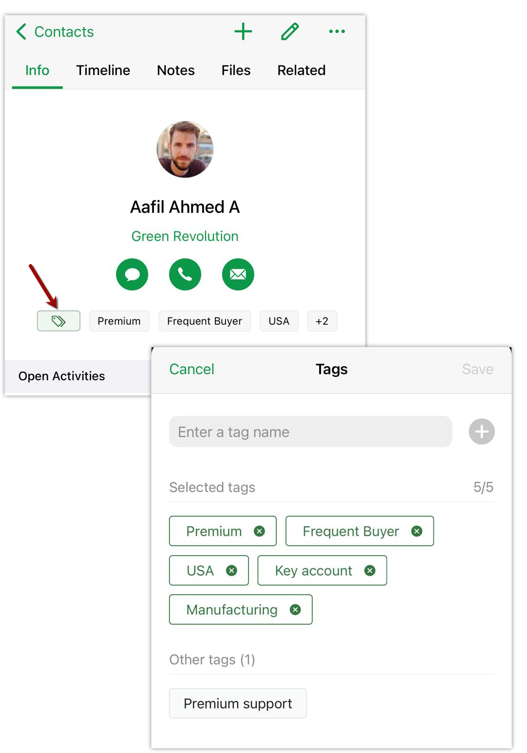 タグは、特定の特徴に基づいてモジュール内のレコードを分類するためのラベルです。たとえば、ビジネスとの関係に基づいて連絡先を分類したい場合、'顧客'、'見込み客'、'ベンダー'などのタグを使用することができます。タグの追加オプションは、連絡先、企業、製品、パイプライン、アクティビティのモジュールで利用できます。