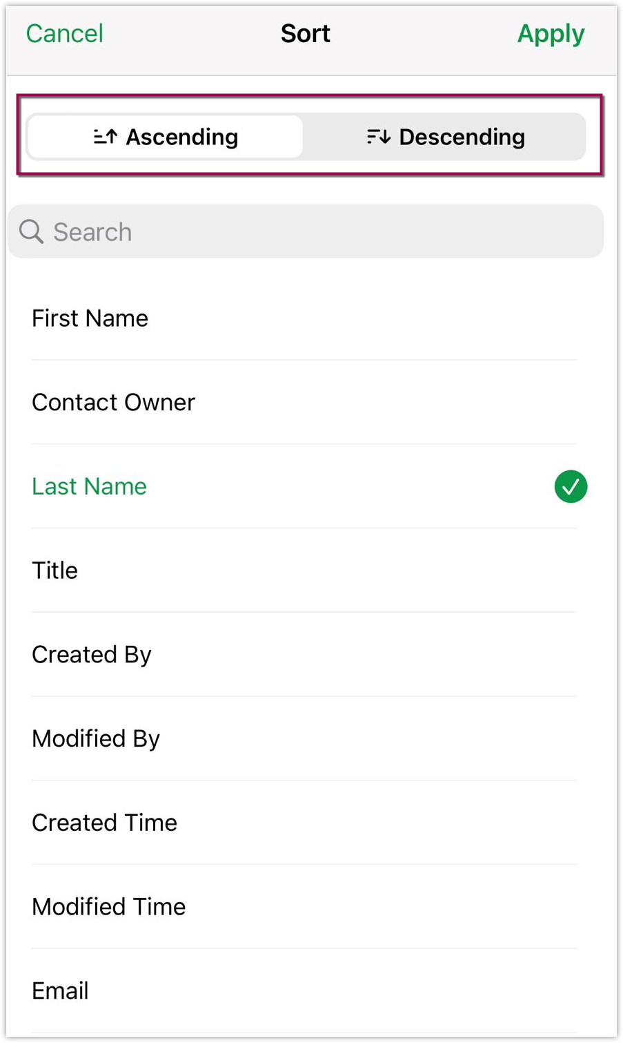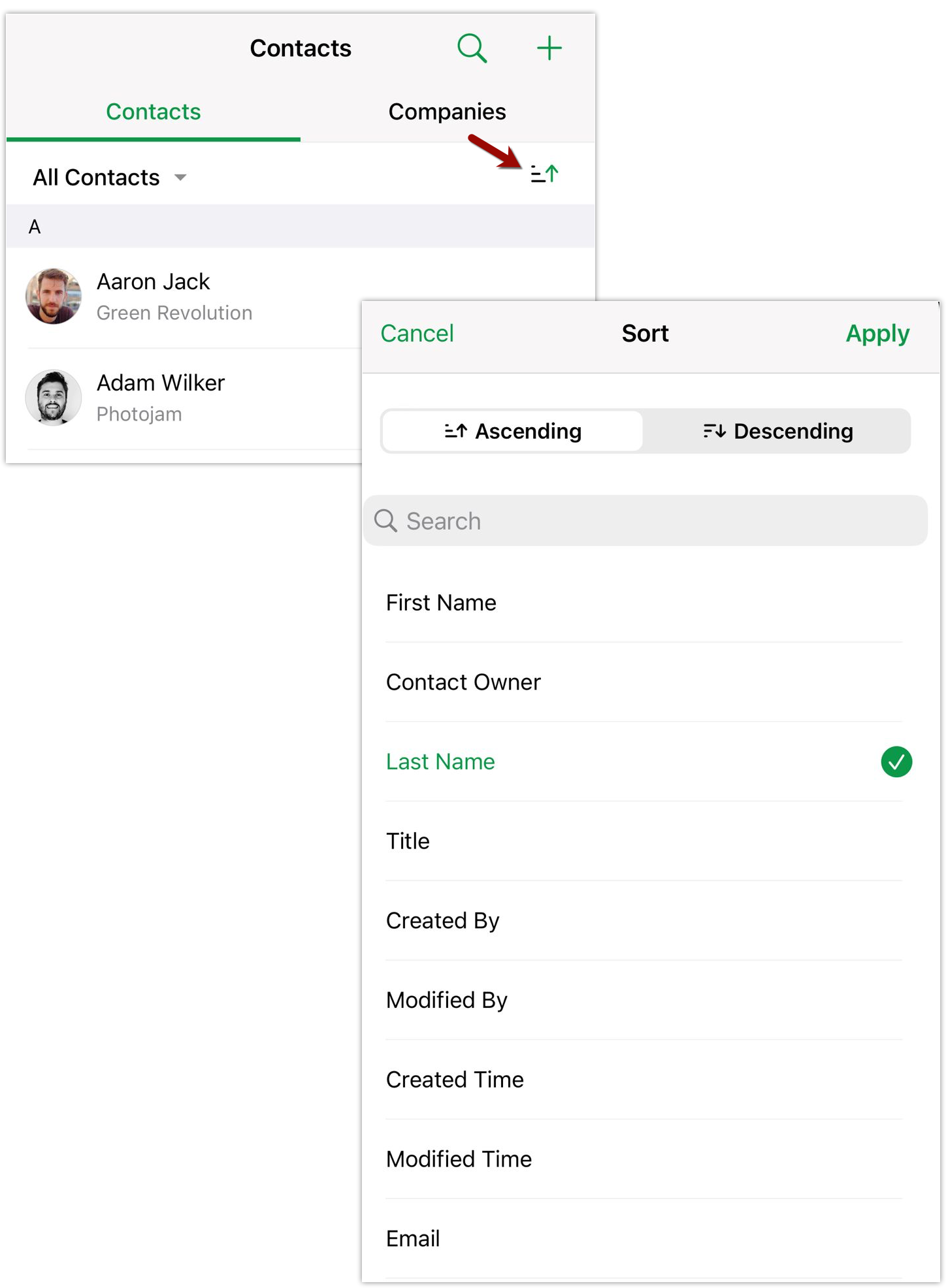 お知らせ:当社は、お客様により充実したサポート情報を迅速に提供するため、本ページのコンテンツは機械翻訳を用いて日本語に翻訳しています。正確かつ最新のサポート情報をご覧いただくには、本内容の英語版を参照してください。 レコードを並べ替えるには 1. iPhoneでBiginアプリを開きます。 2. 連絡先モジュールに移動します。 3. 画面の右上にあるソート アイコンをタップします。 4. リストから基準を選択してください。 5. レコードをソートする順序を選択します - 昇順または降順。 6. ...
