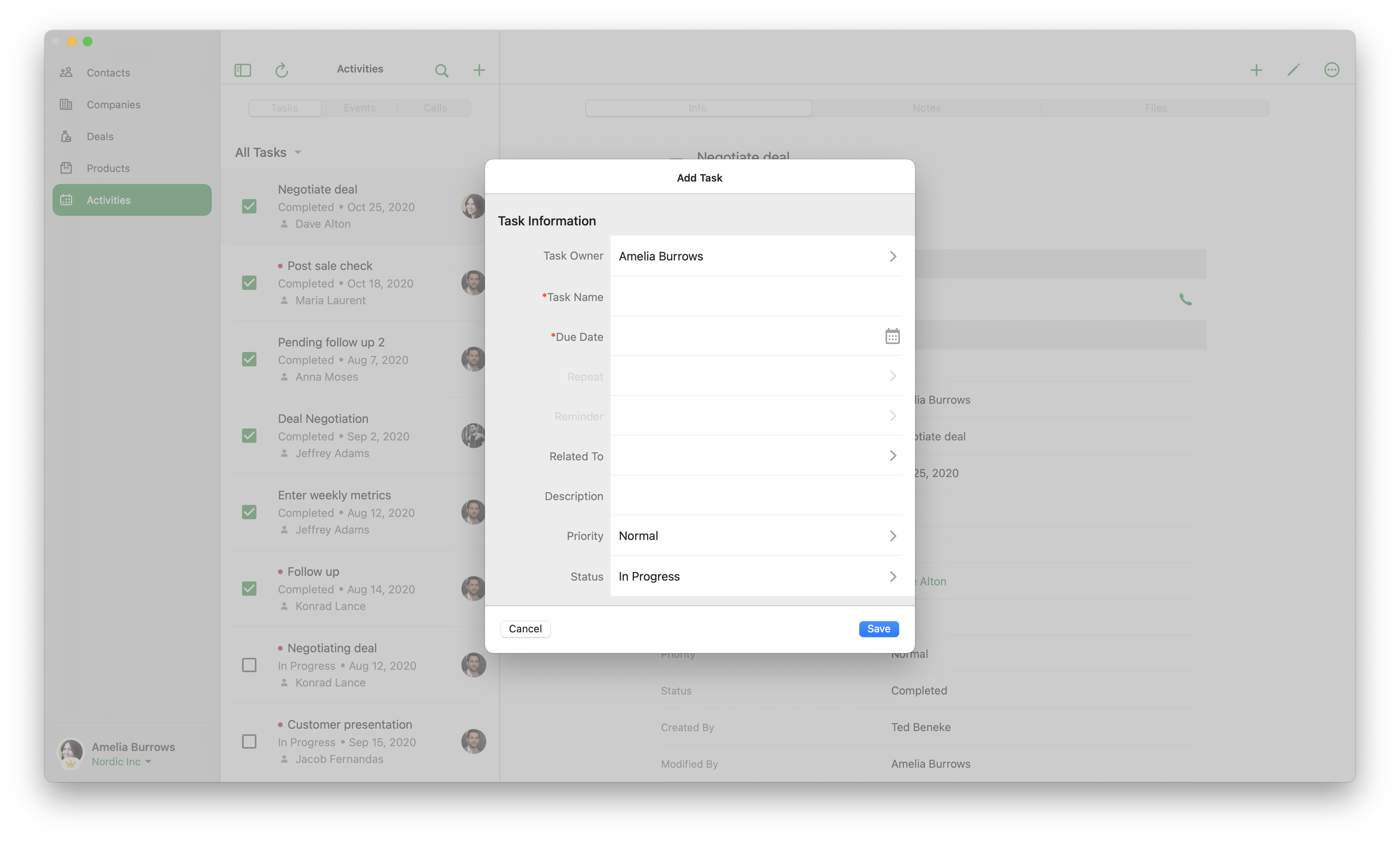 4. ノート、タスク、イベント、通話の場合は、詳細を指定し、[保存]をクリックします。