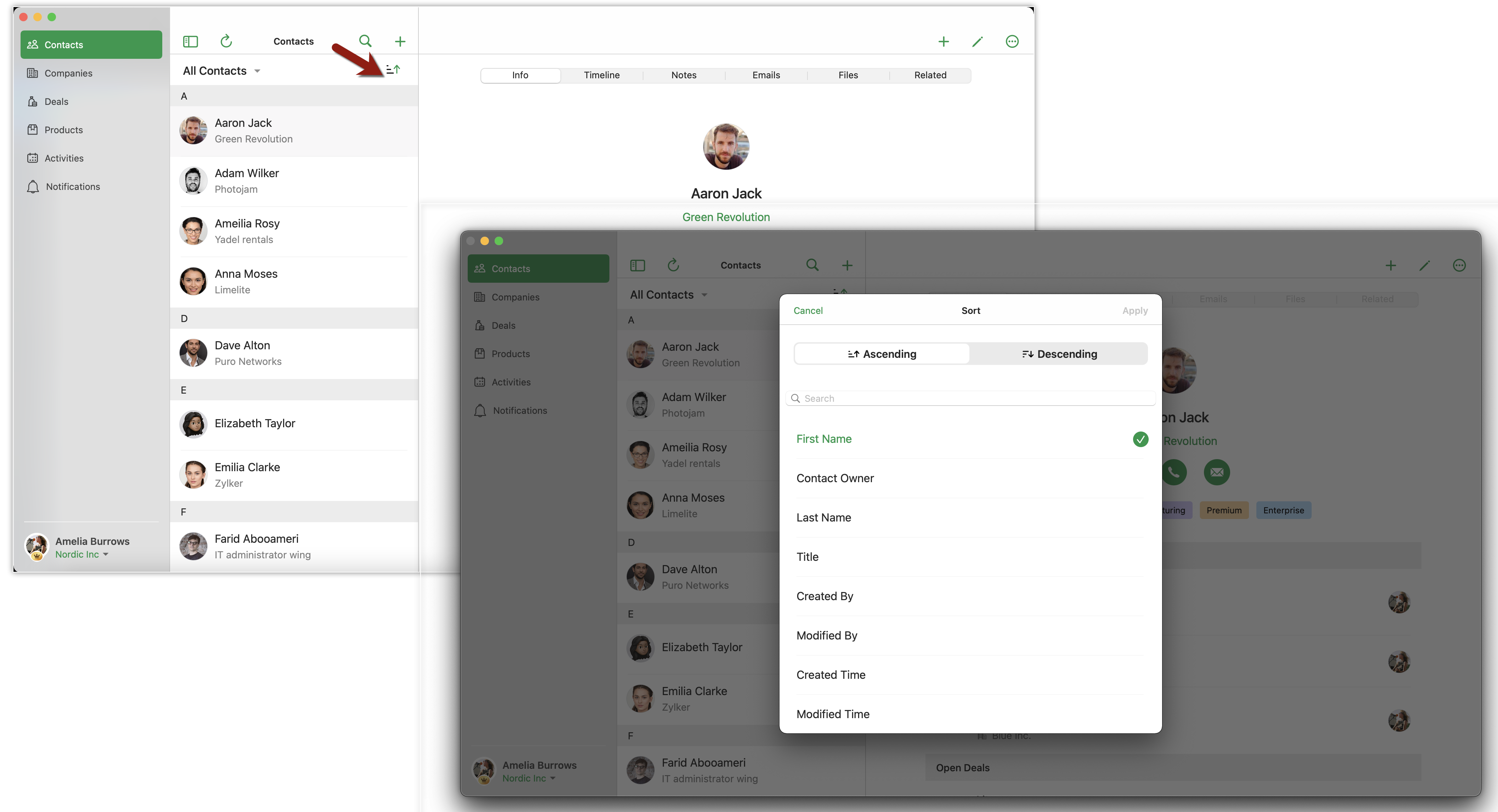お知らせ:当社は、お客様により充実したサポート情報を迅速に提供するため、本ページのコンテンツは機械翻訳を用いて日本語に翻訳しています。正確かつ最新のサポート情報をご覧いただくには、本内容の英語版を参照してください。 レコードを並べ替える方法 1. Mac上でBiginアプリを開きます。 2. 連絡先モジュールに移動します 。 3. 画面の左上にあるソート アイコンをクリックしてください。 4. リストから基準を選択してください。 5. レコードをソートする順序を選択します - 昇順または降順。 ...