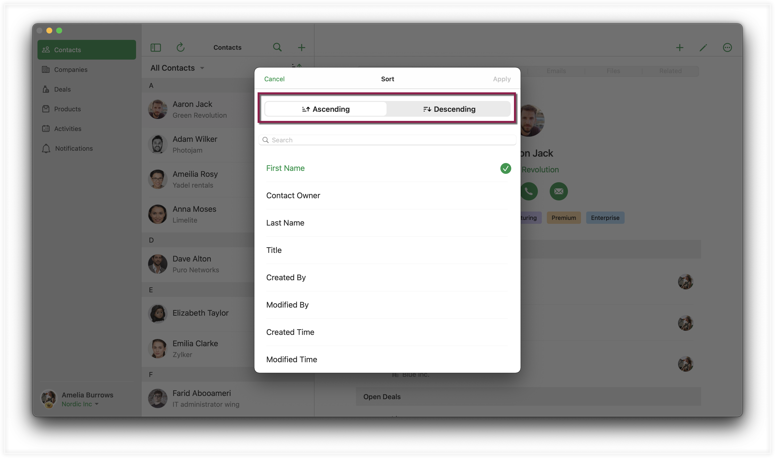 データを表示する方法に基づいて、レコードをソートすることができます。たとえば、[連絡先]モジュールでは、[名前]、[担当者]、または[姓]など、そのモジュールに関連するソート基準を見つけることができます。同様に、[パイプライン]モジュールでは、[取引名]、[金額]、または[取引担当者]などの基準でレコードをソートすることができます。