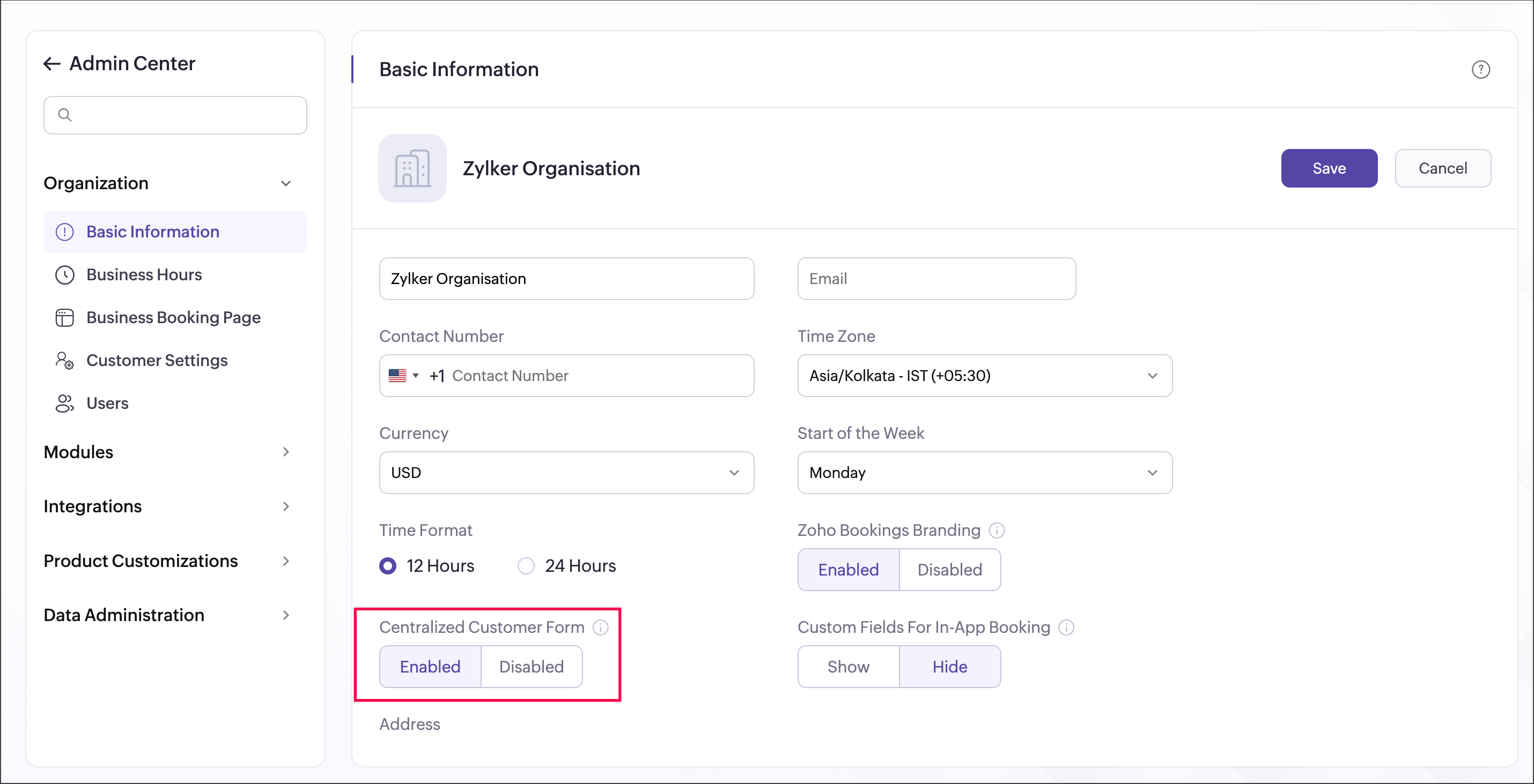組織の基本情報には、ビジネス名、連絡先電話番号、メールアドレスなど、ビジネスに関する基本的な情報が含まれます。さらに、Bookings 組織全体に適用されるタイムゾーン、時刻形式、通貨の情報も含まれます。また、予約ページに表示される Powered by Zoho Bookings のテキストを削除できる「Zoho Bookings ブランディング」オプションも用意されています。