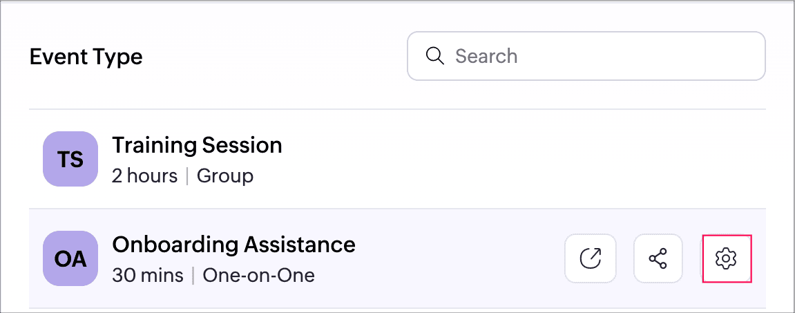 - 特定のワークスペース配下のすべてのイベントタイプが一覧表示されます。顧客はイベントタイプを選択して予約を行えます。