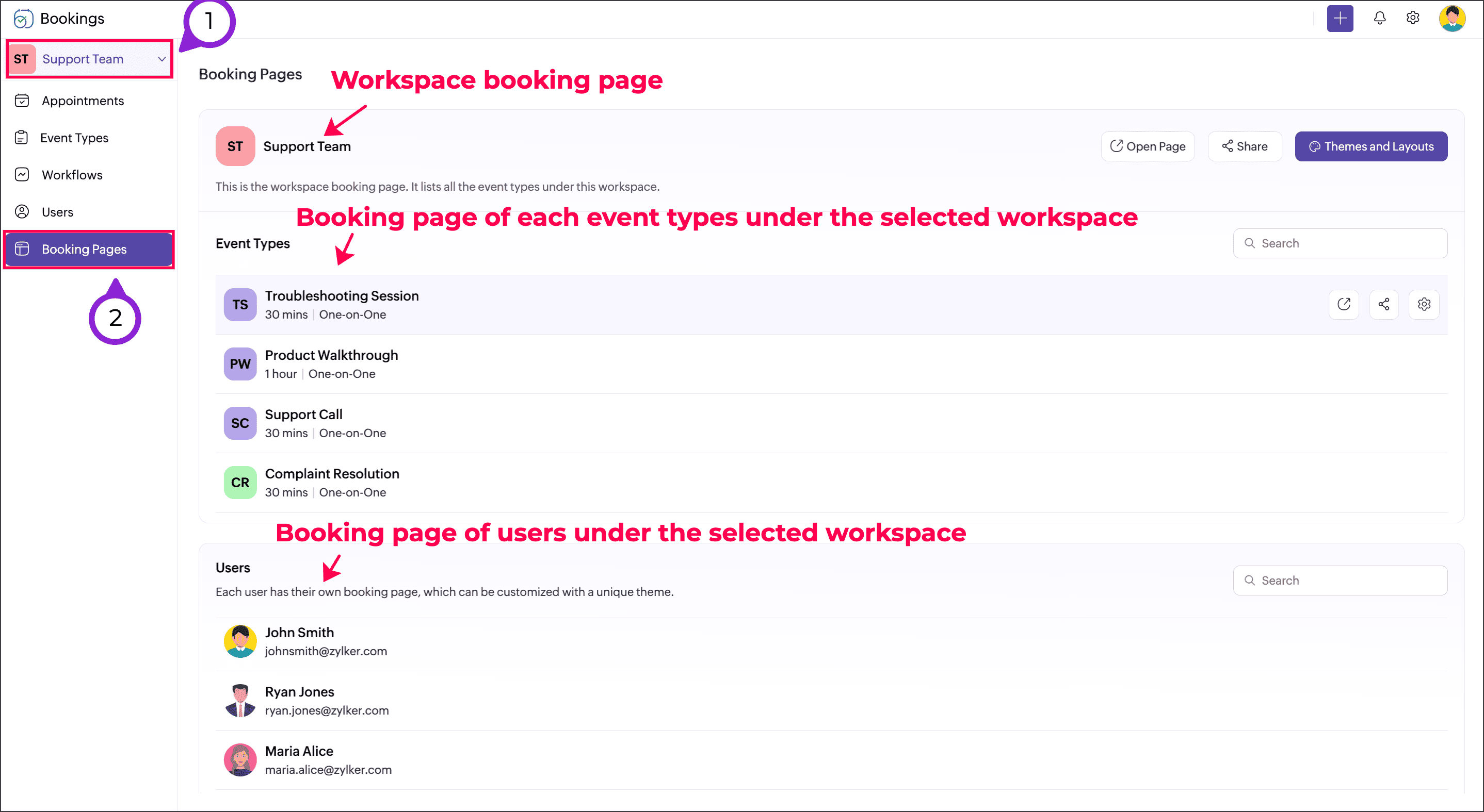 現在のワークスペースに割り当てられているすべてのユーザー予約ページが右側に一覧表示されます