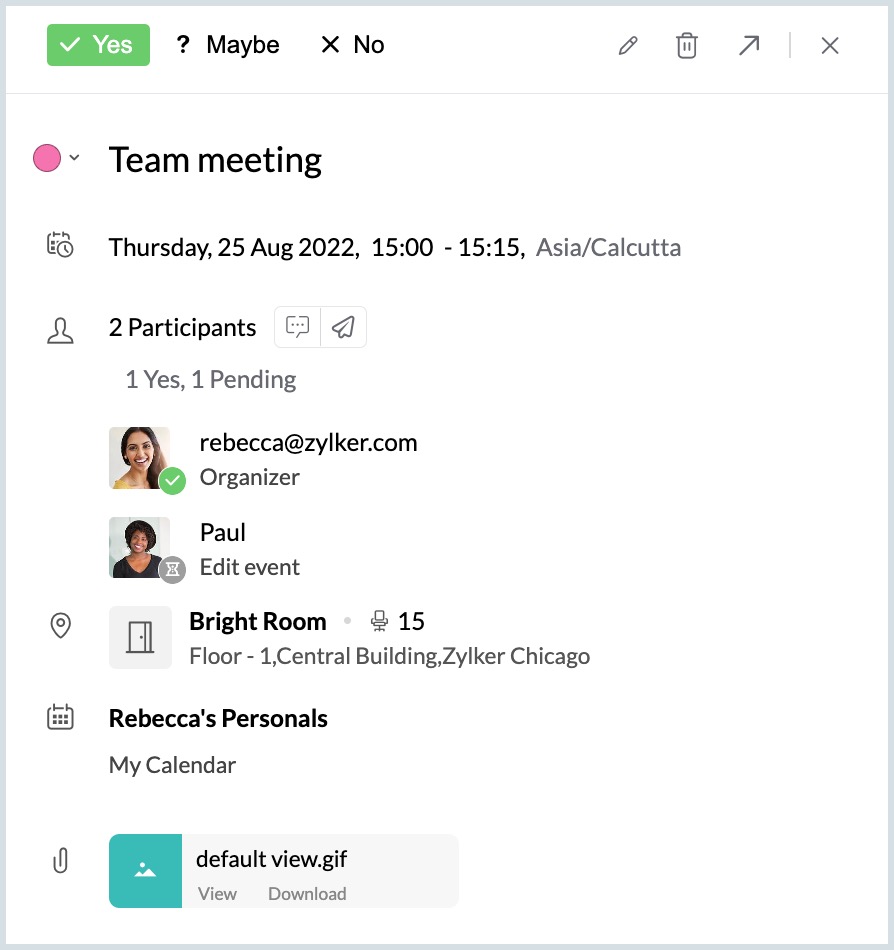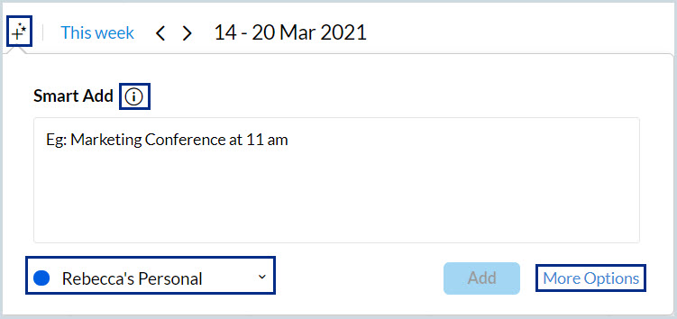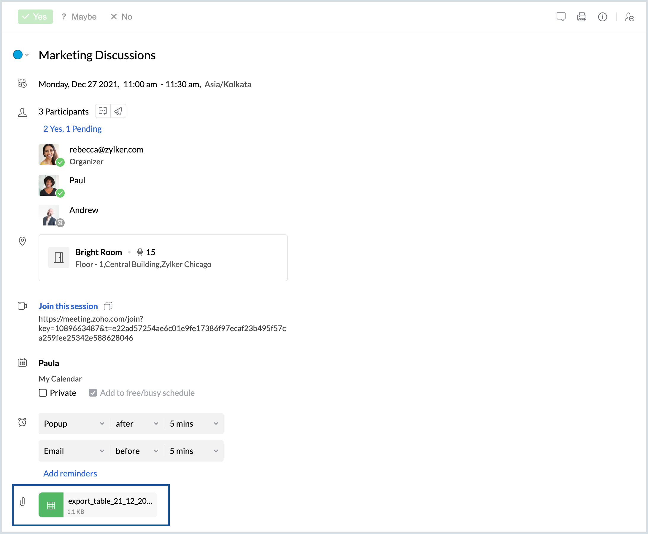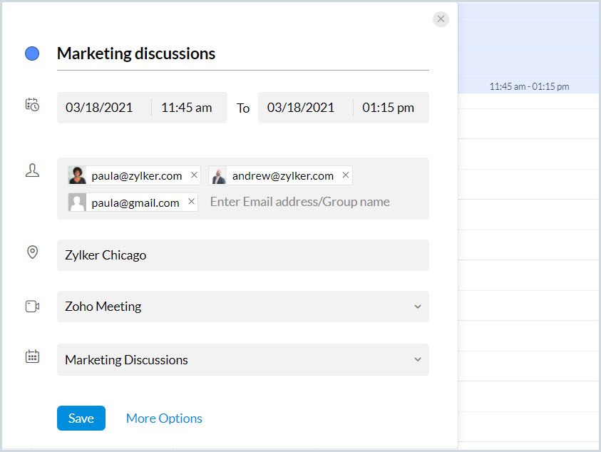 現在の時間から3時間後に1時間のイベント、「Meet Paula in 3時間」を作成します。 |