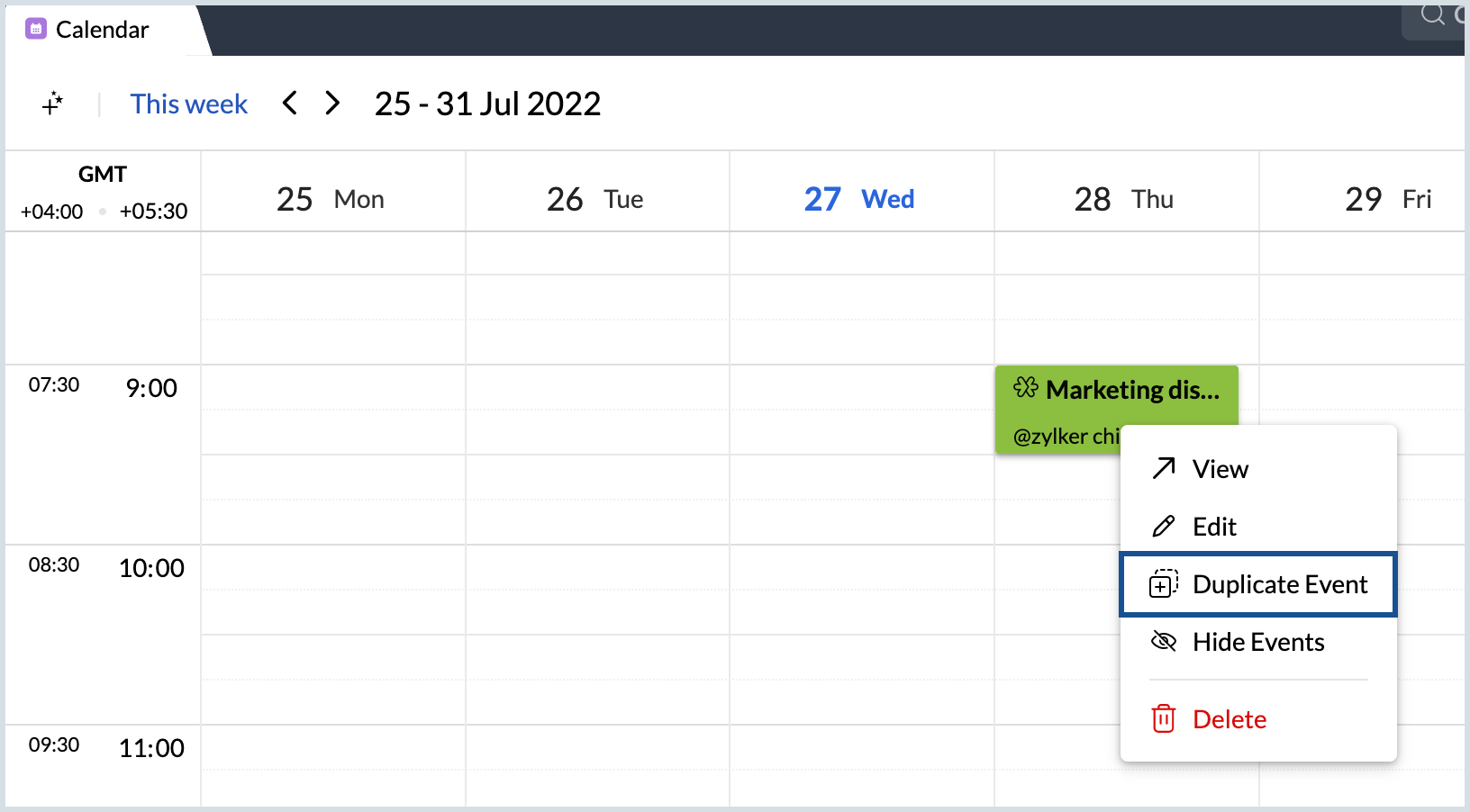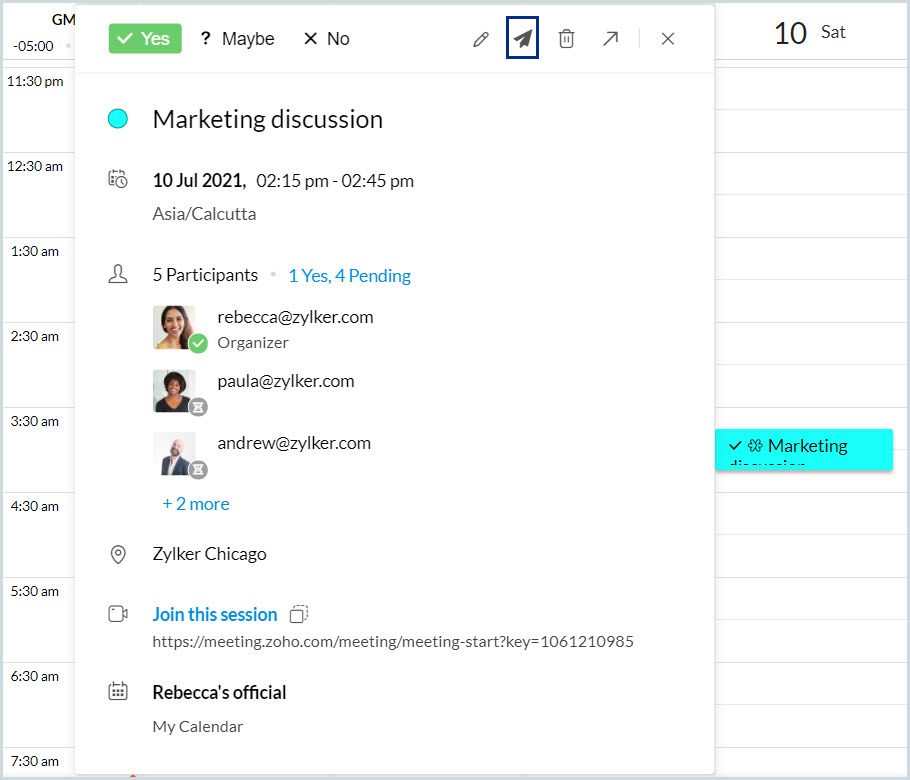 現在の日付の10時から11時までのイベント、「Team 予定」を作成します。 |