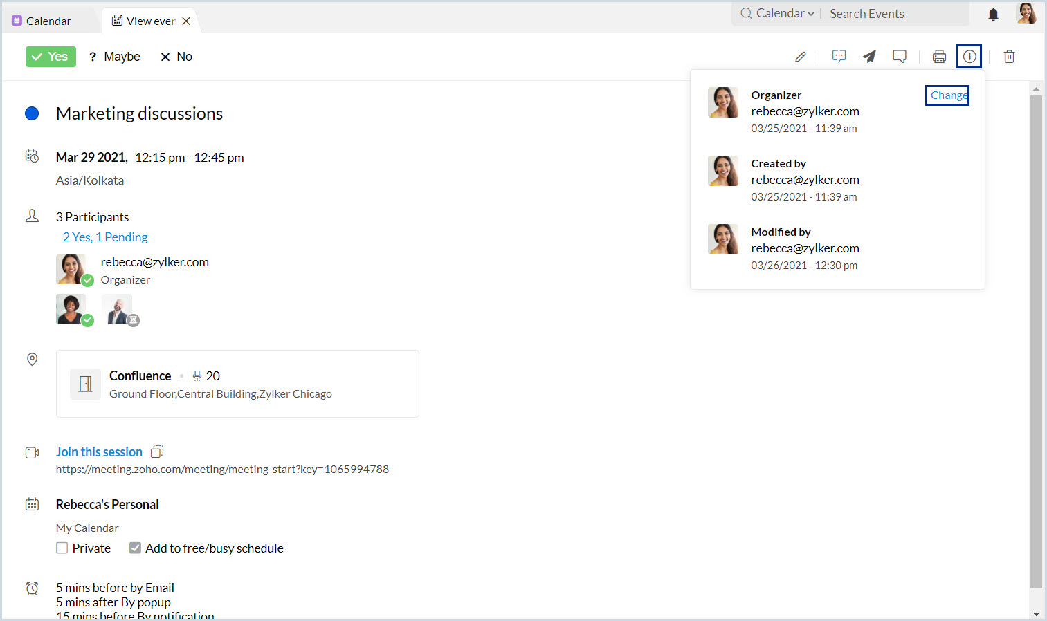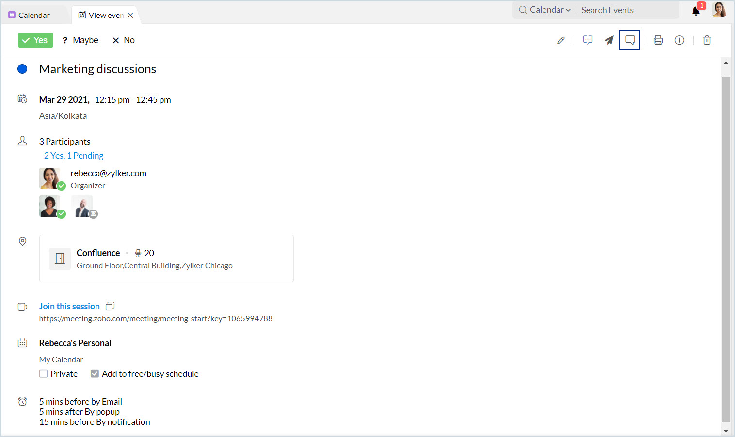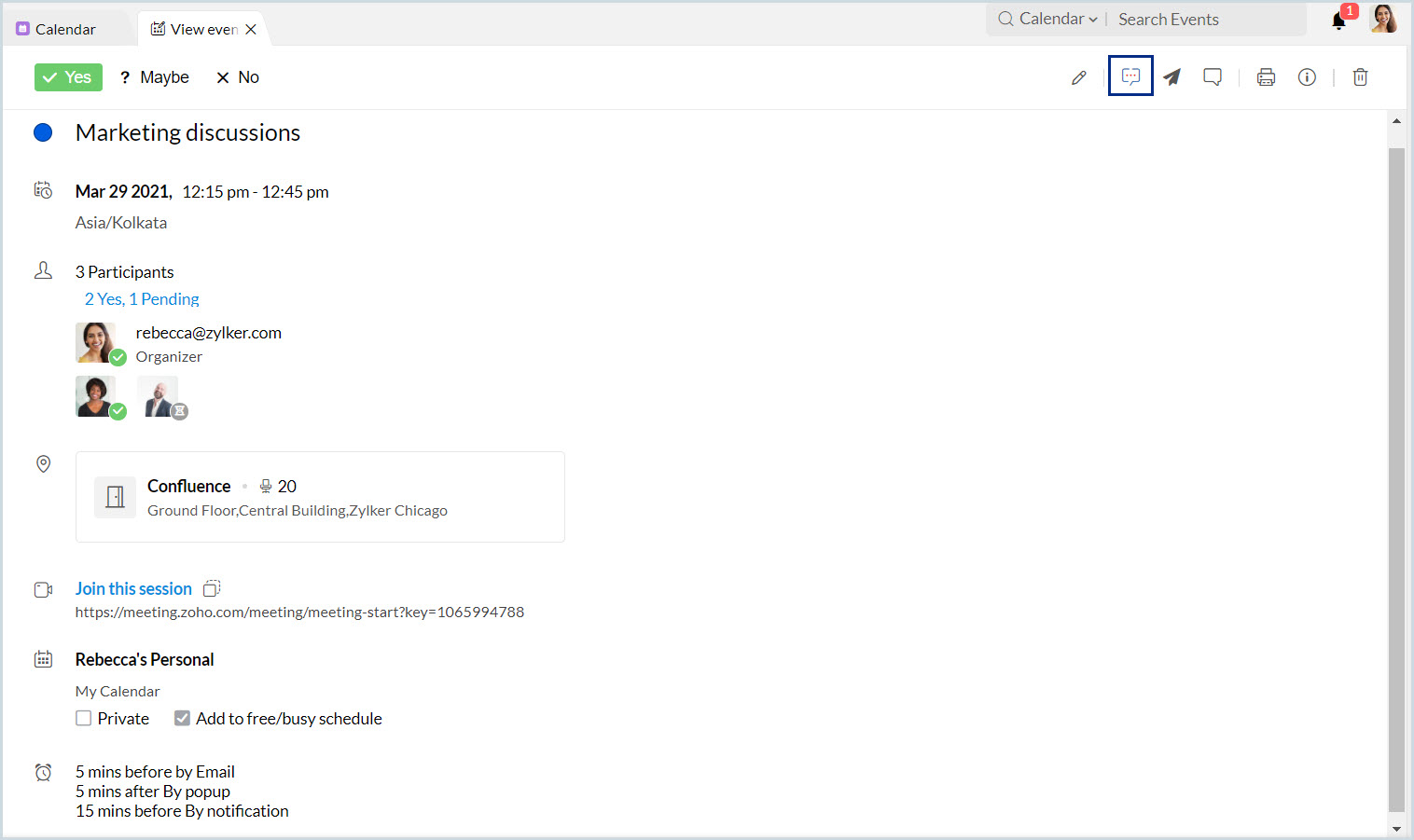 Zoho Calendarでは、同僚やチームメンバーにあなたが作成した処理の共同組織者となる権限を与えることができます。また、チャットやコメントを通じて直感的な会話を交わし、コンテキストに基づいたコミュニケーションを行うことができます。