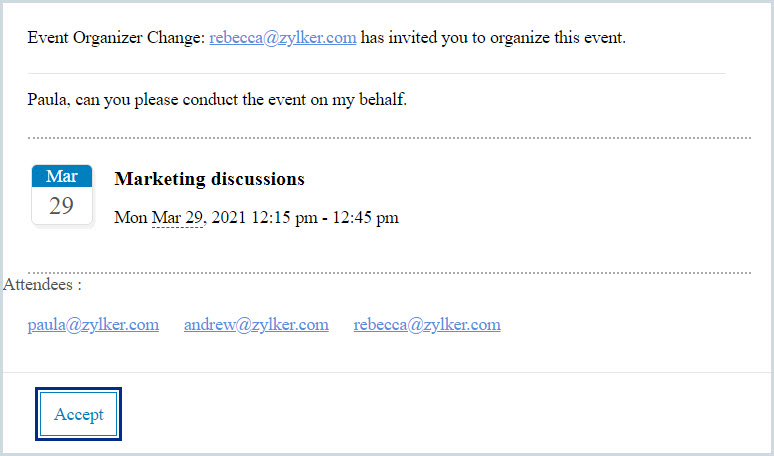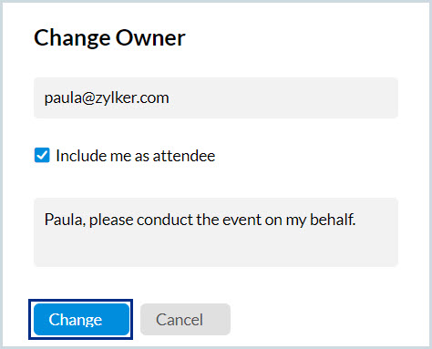 4. 新しいオーガナイザーの変更する Organizer対話ボックスで、新しいオーガナイザーのメールアドレスと必要に応じてメッセージを入力します。